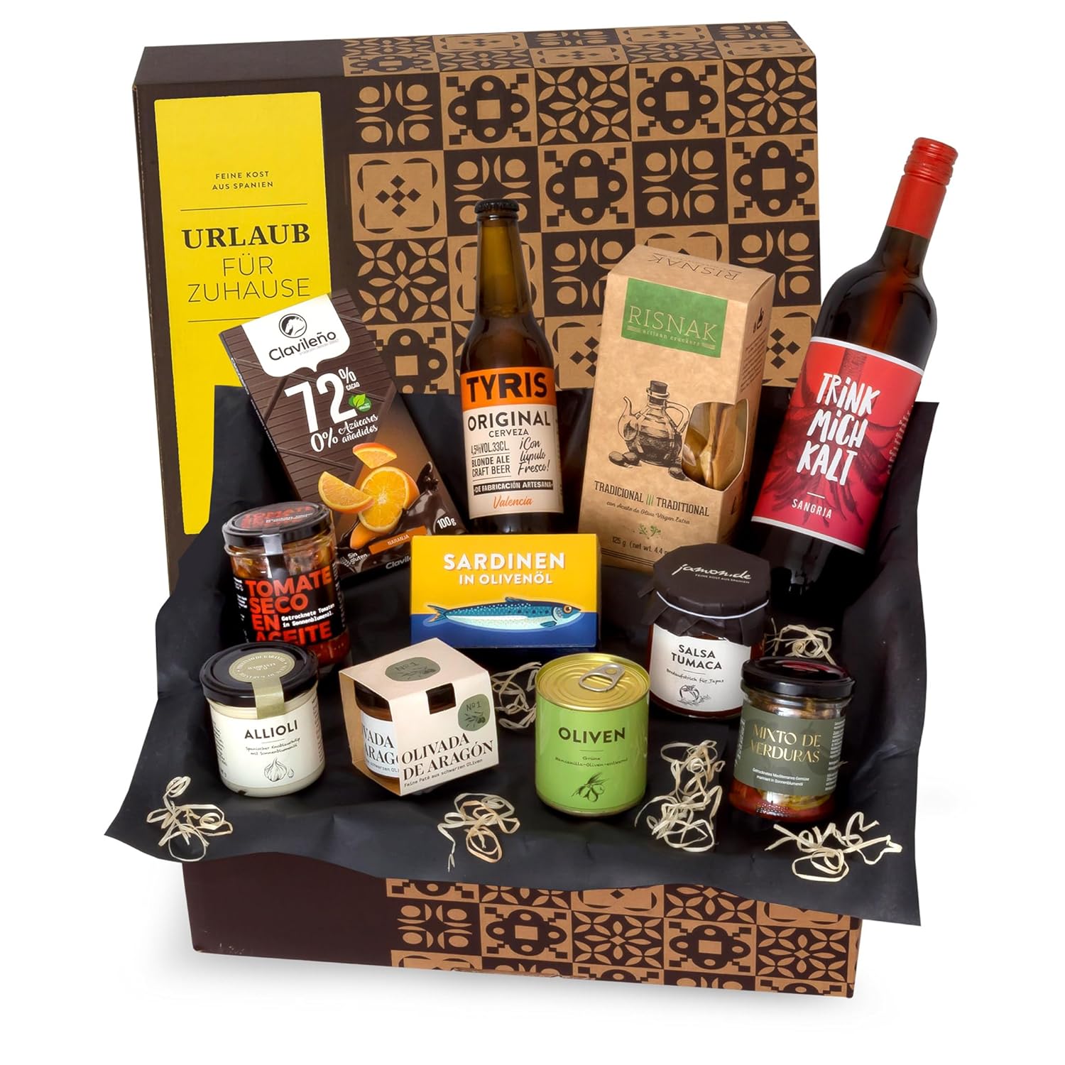 Wein-Präsentkörbe - Geschenkbox Urlaub für zu Hause – Gefüllter Geschenkkorb mit Sangría und mediterranen Leckereien von jamon.de – Gourmet-Geschenk für jeden Anlass