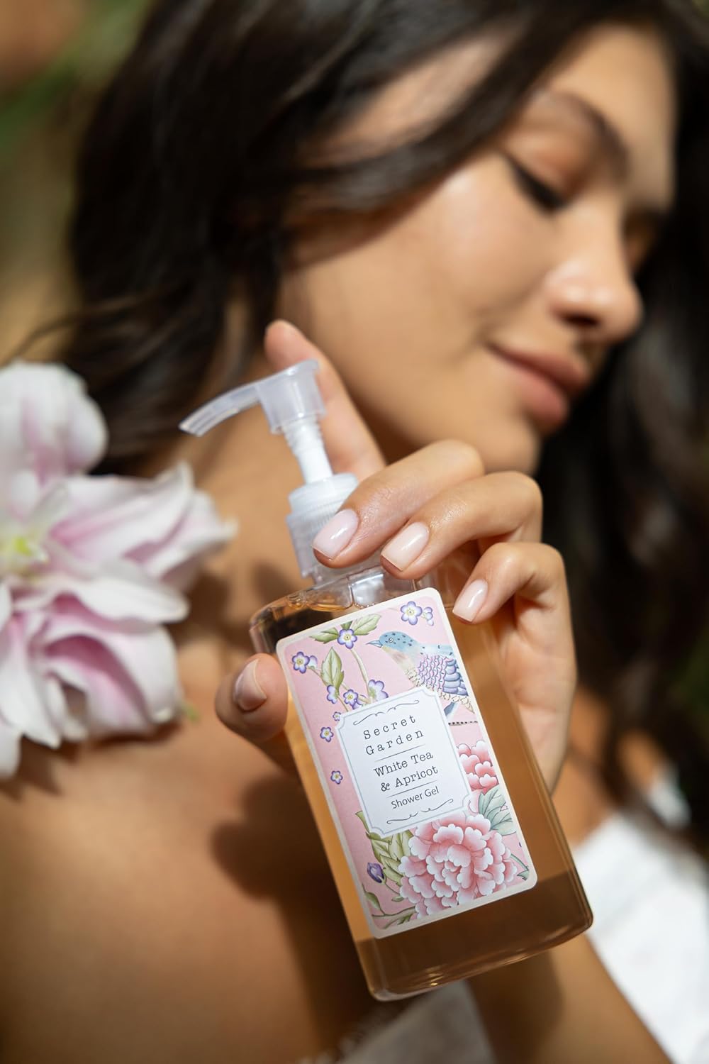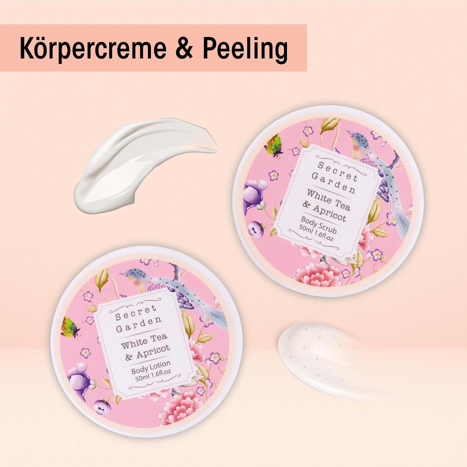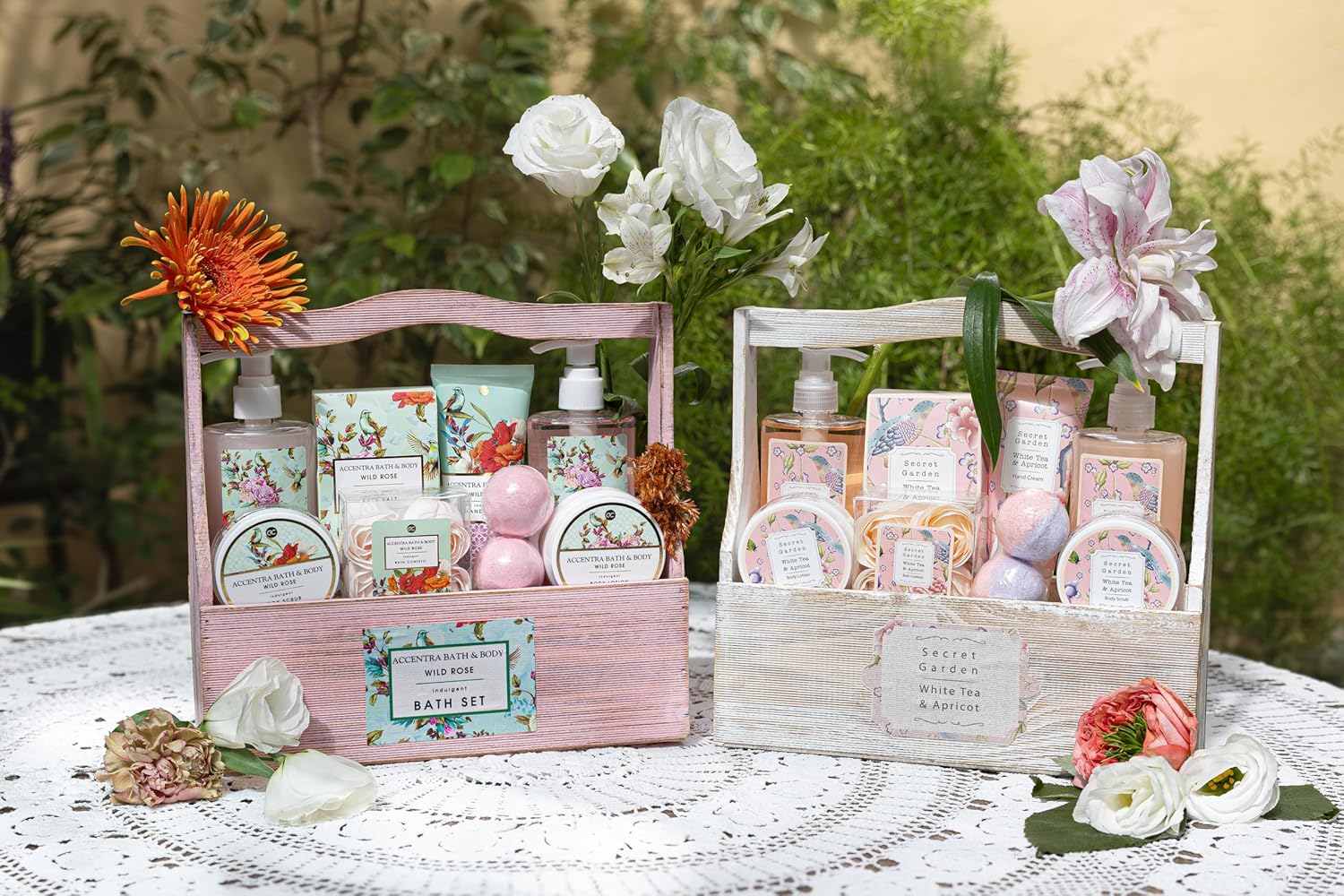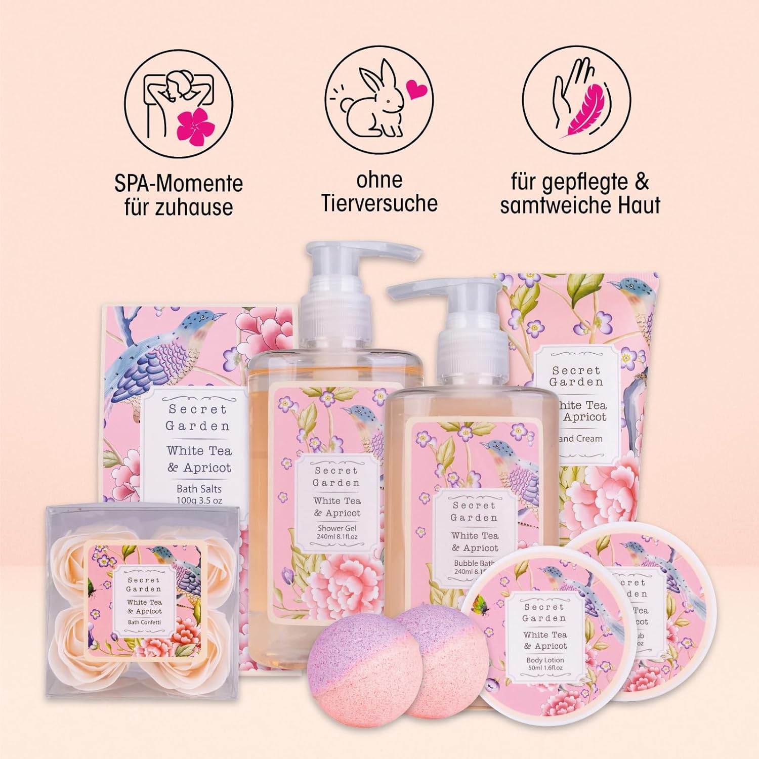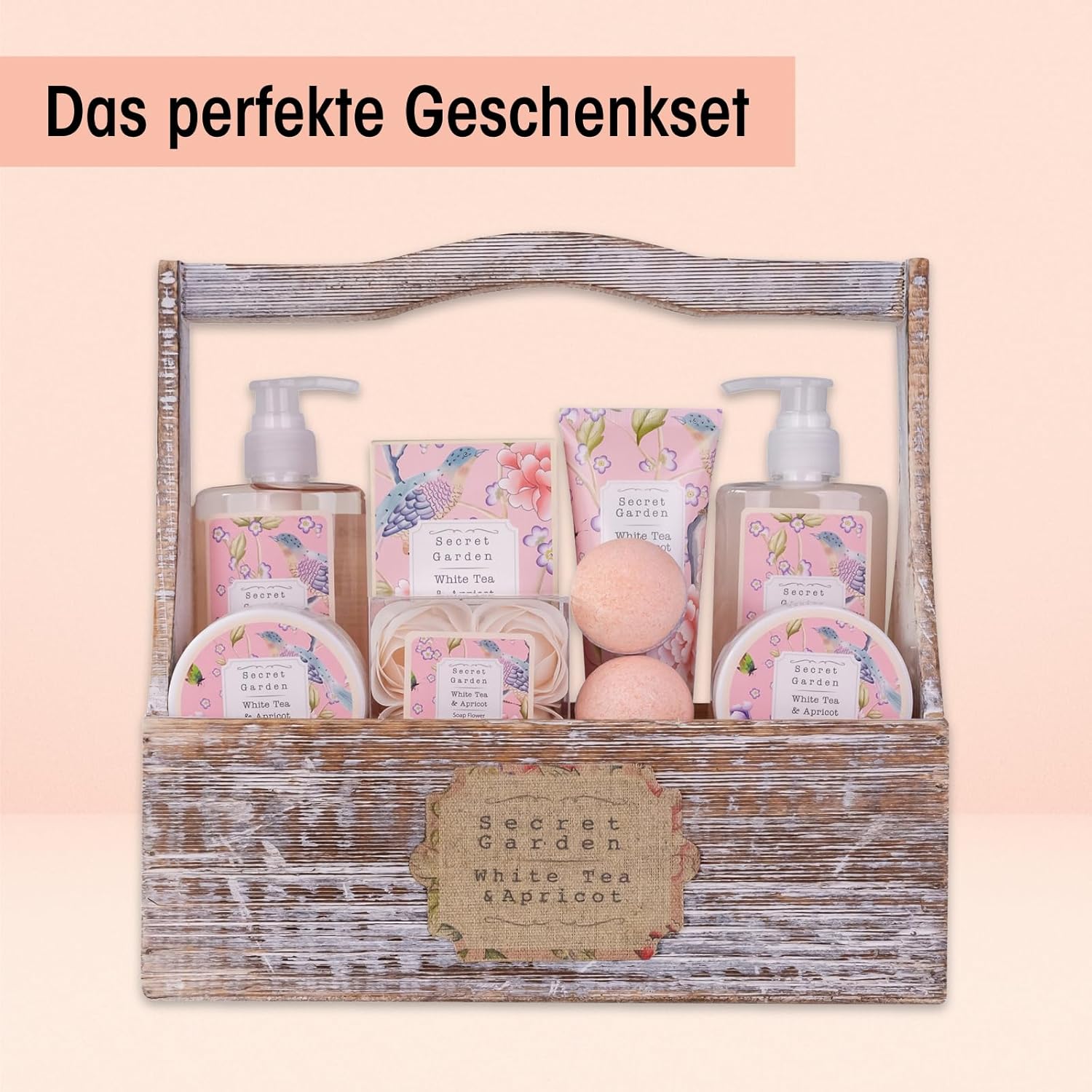 Geburtstags-Präsentkörbe – Accentra Secret Garden Bade- und Dusch-Geschenkset mit weißem Tee- und Aprikosenduft – 8-teiliges Geschenkset