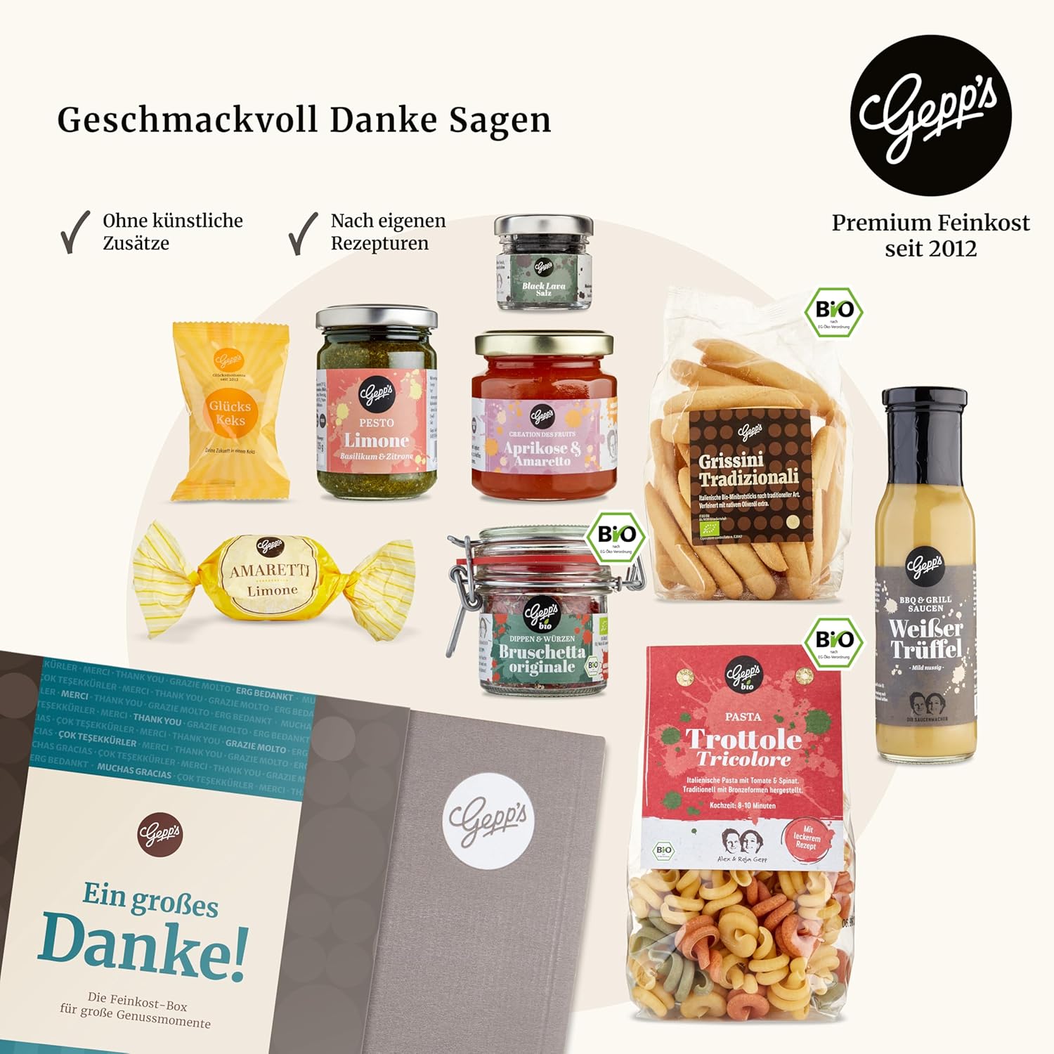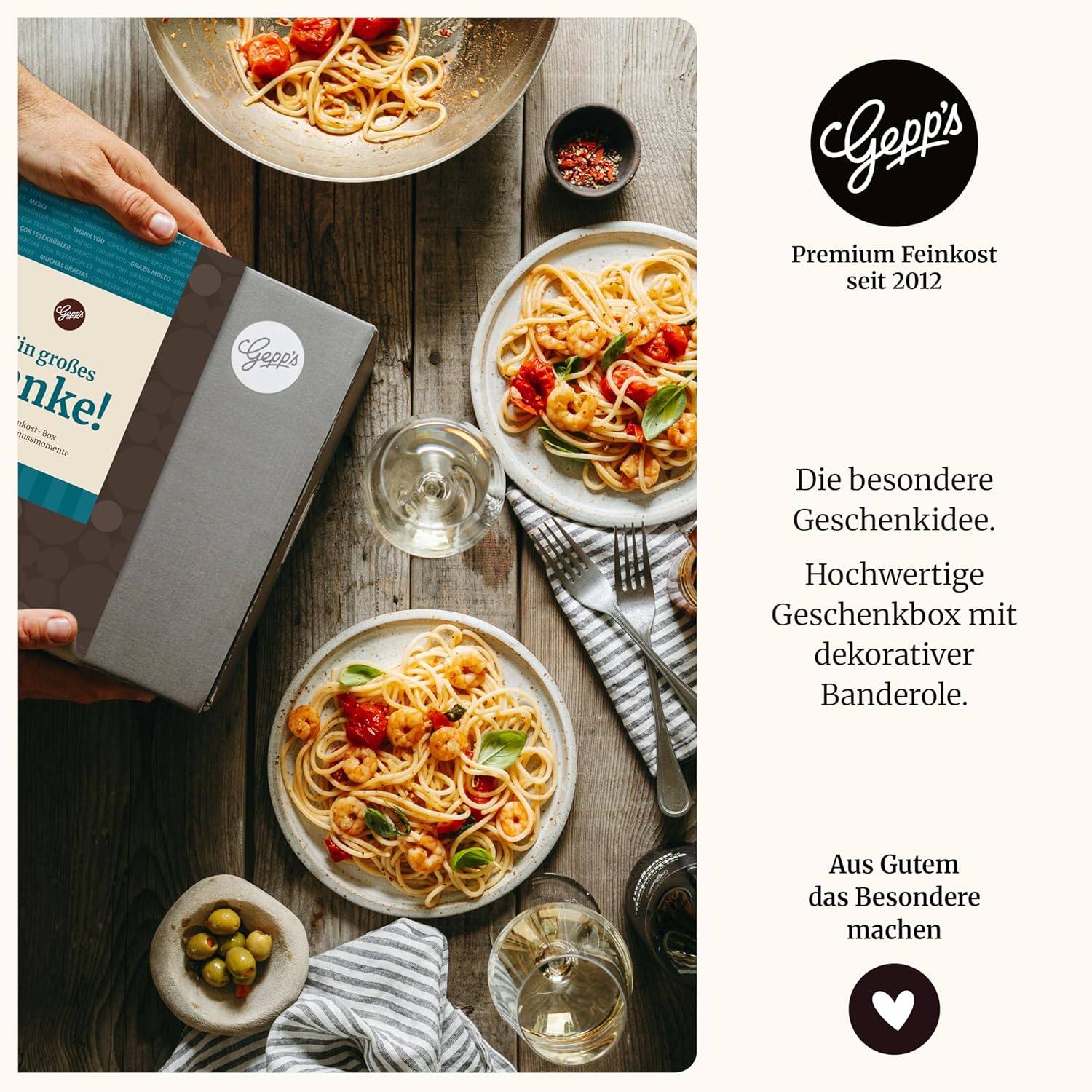 Geburtstags-Präsentkörbe – Gepp’s Delicatessen Dankeschön-Geschenkkorb mit vielen Köstlichkeiten, Firmengeschenk für Mitarbeiter und Kollegen, Spezialitäten wie Pasta, Trüffelsauce, Pesto, Amaretto, Gourmet-Geschenkkorb
