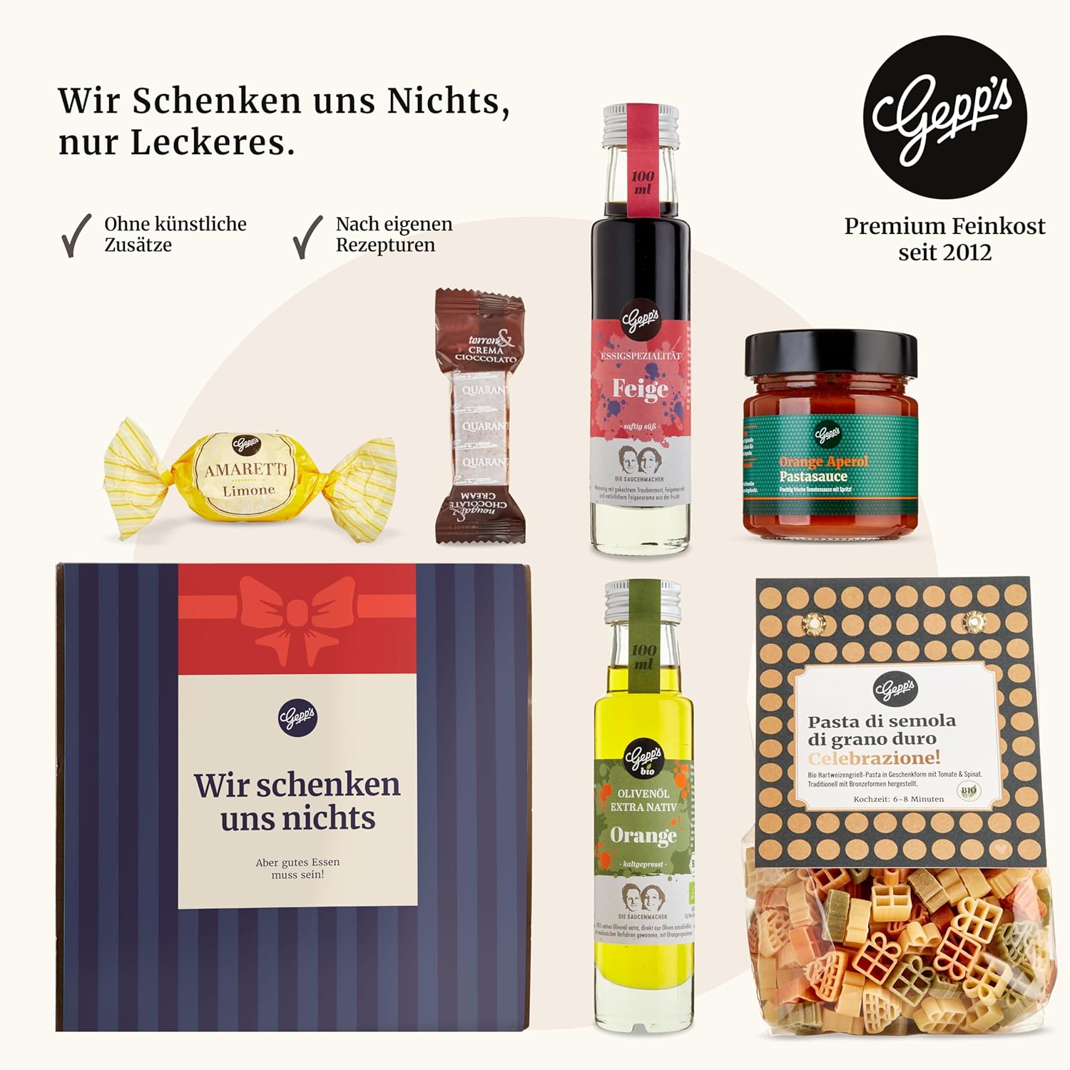 Geburtstags-Präsentkörbe – Gepp’s Feinkost Geschenkbox „Wir Schenken Uns Nichts“, witziges Geschenk für Männer und Frauen, Geschenkbox mit Köstlichkeiten, witziges Geschenkset