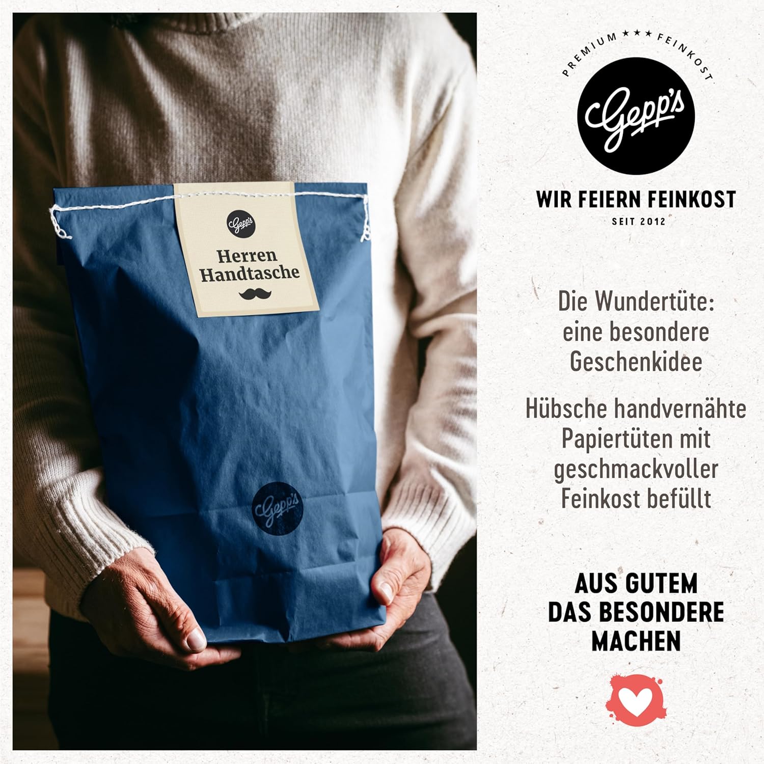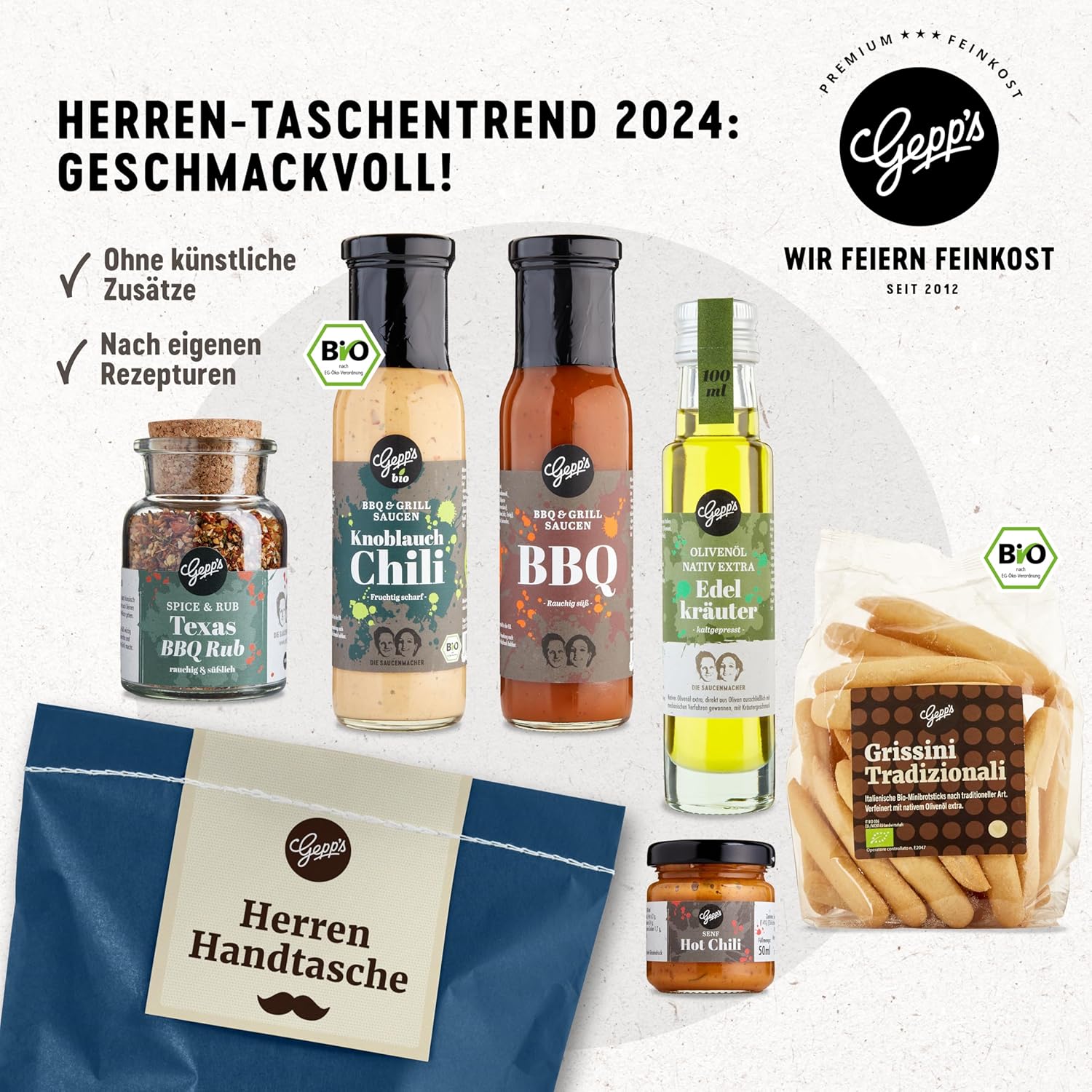 Geburtstags-Präsentkörbe – Gepp’s Feinkost Herrenhandtasche, witziges Männergeschenk gefüllt mit Köstlichkeiten wie Knoblauch-Chili-Sauce, wertvollem Kräuter-Olivenöl, Texas BBQ Rub, Geschenkidee für Ehemann, Bruder und Onkel