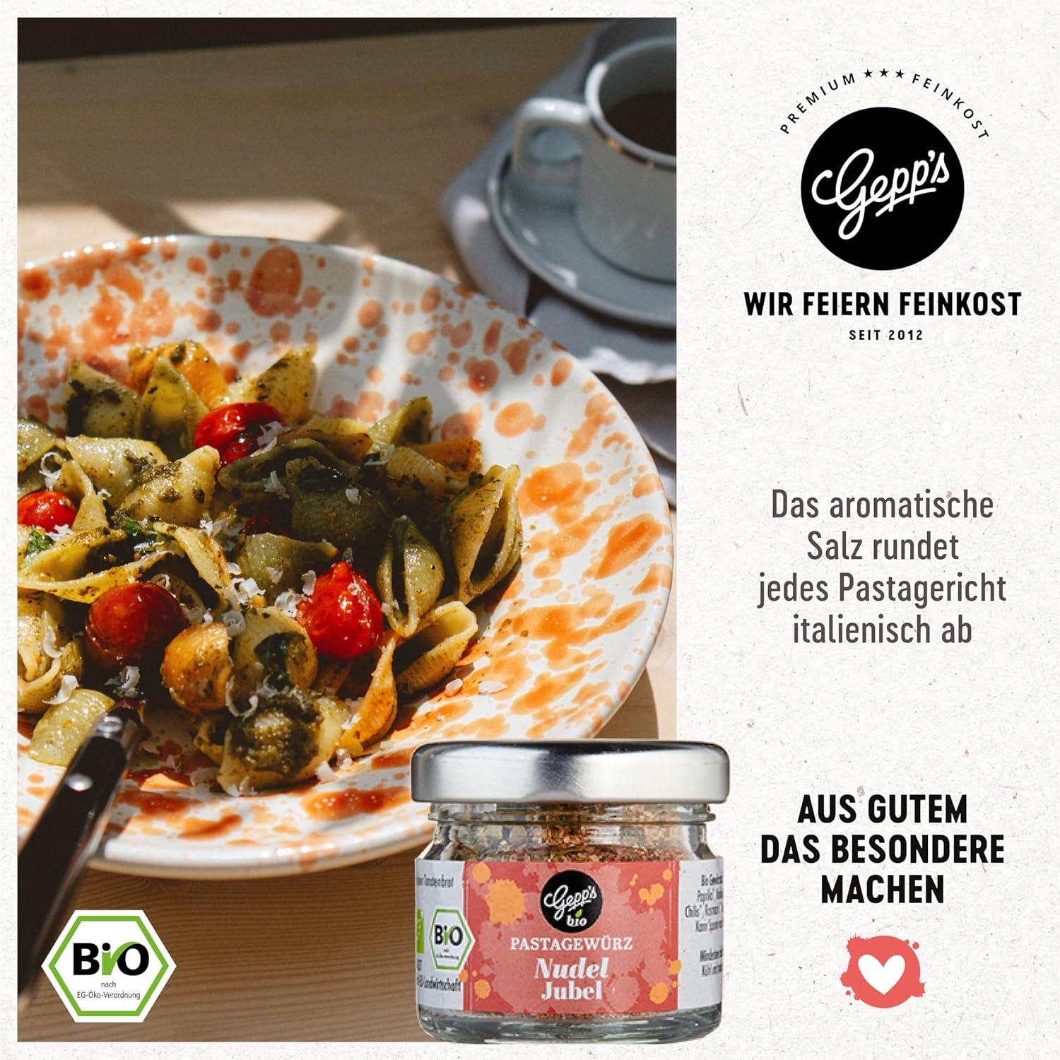 Mit unserem Nudeljubel Pastagewürz zauberst du eine mediterrane Note zu Pasta oder auf das Tomatenbrot.