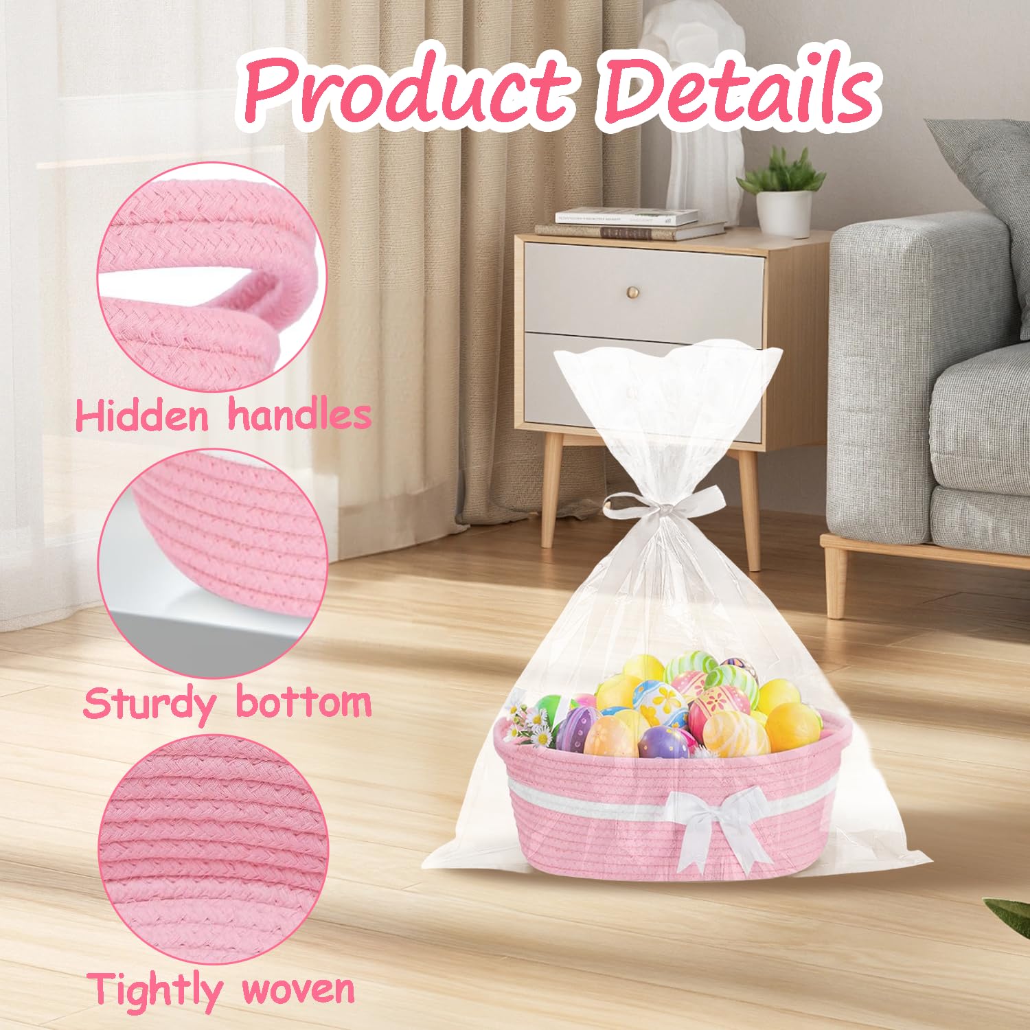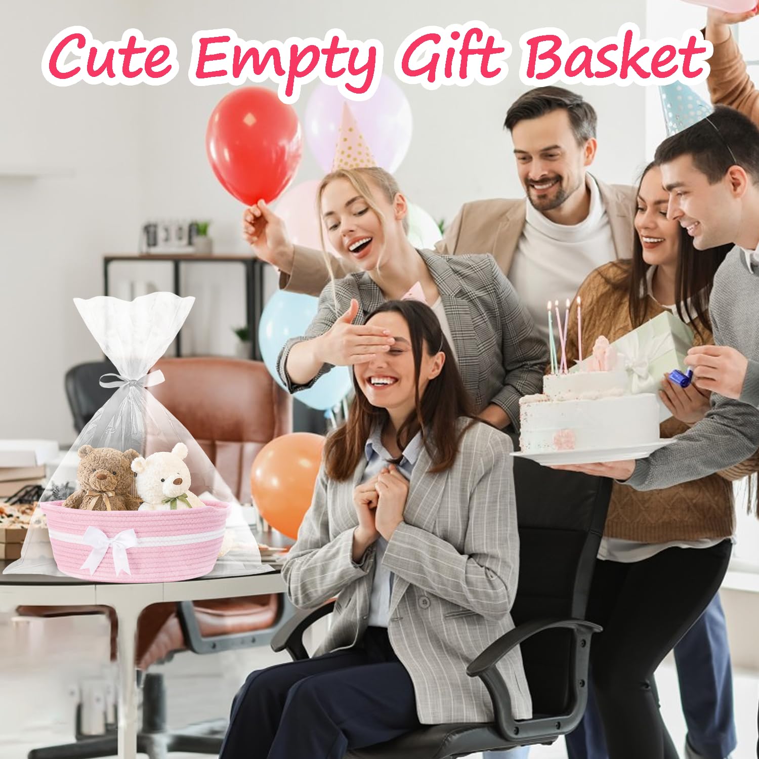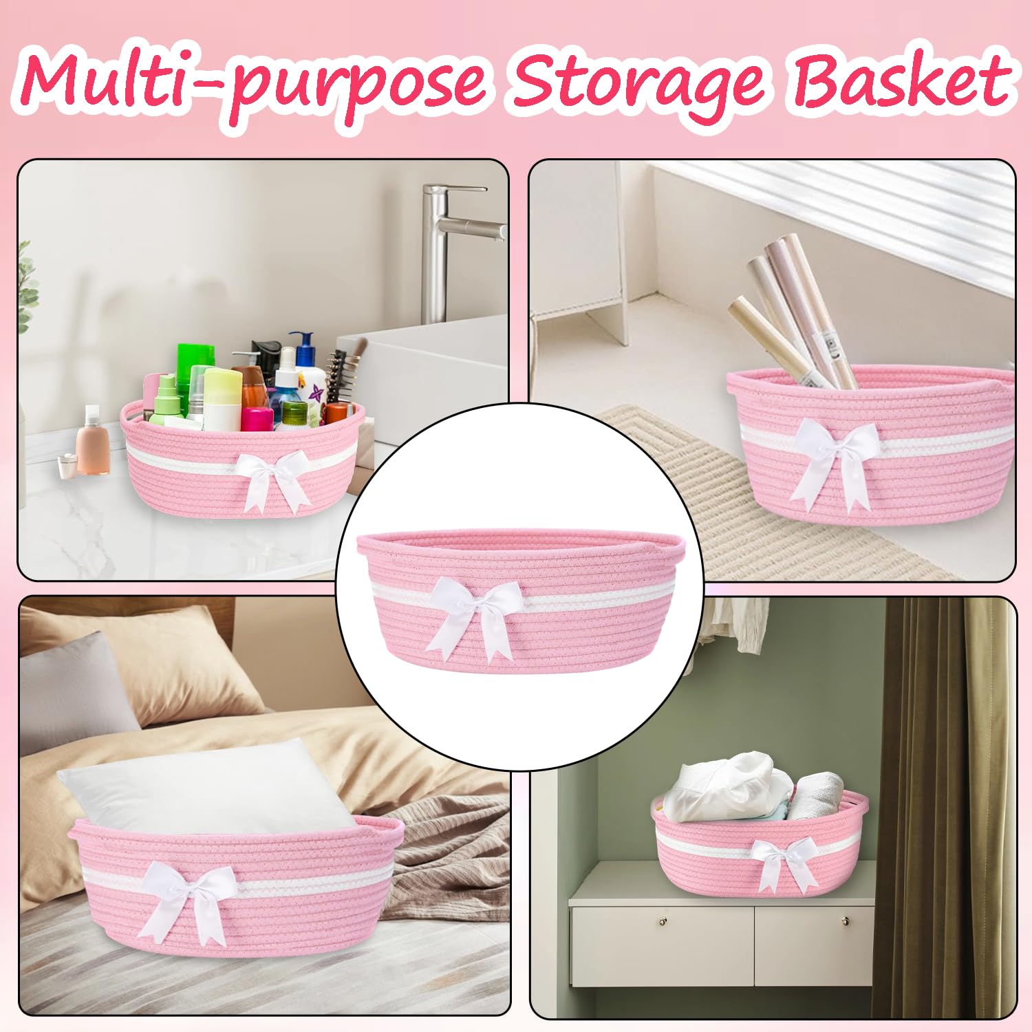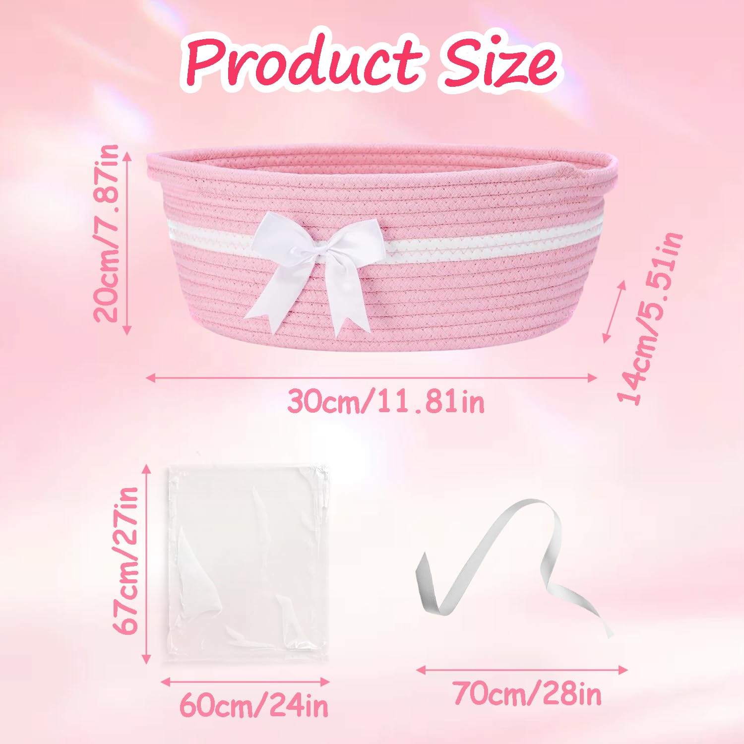 Geburtstags-Präsentkörbe – Rosa Geschenkkörbe, Babykorb, Korb aus gewebtem Baumwollseil, Geschenkkorb, Korbset mit Geschenktüten und Bändern, rosa Korb mit Griffen für Babyparty, Hochzeit, Geburtstag, 30 x 20 x 14 cm