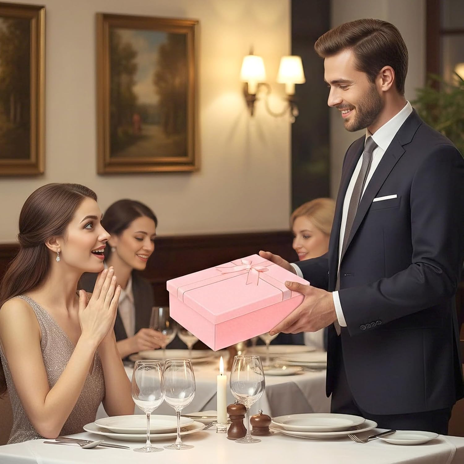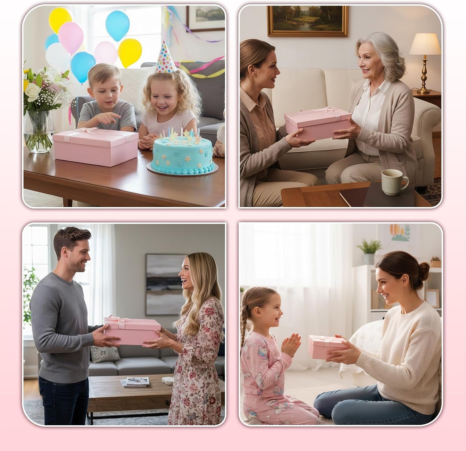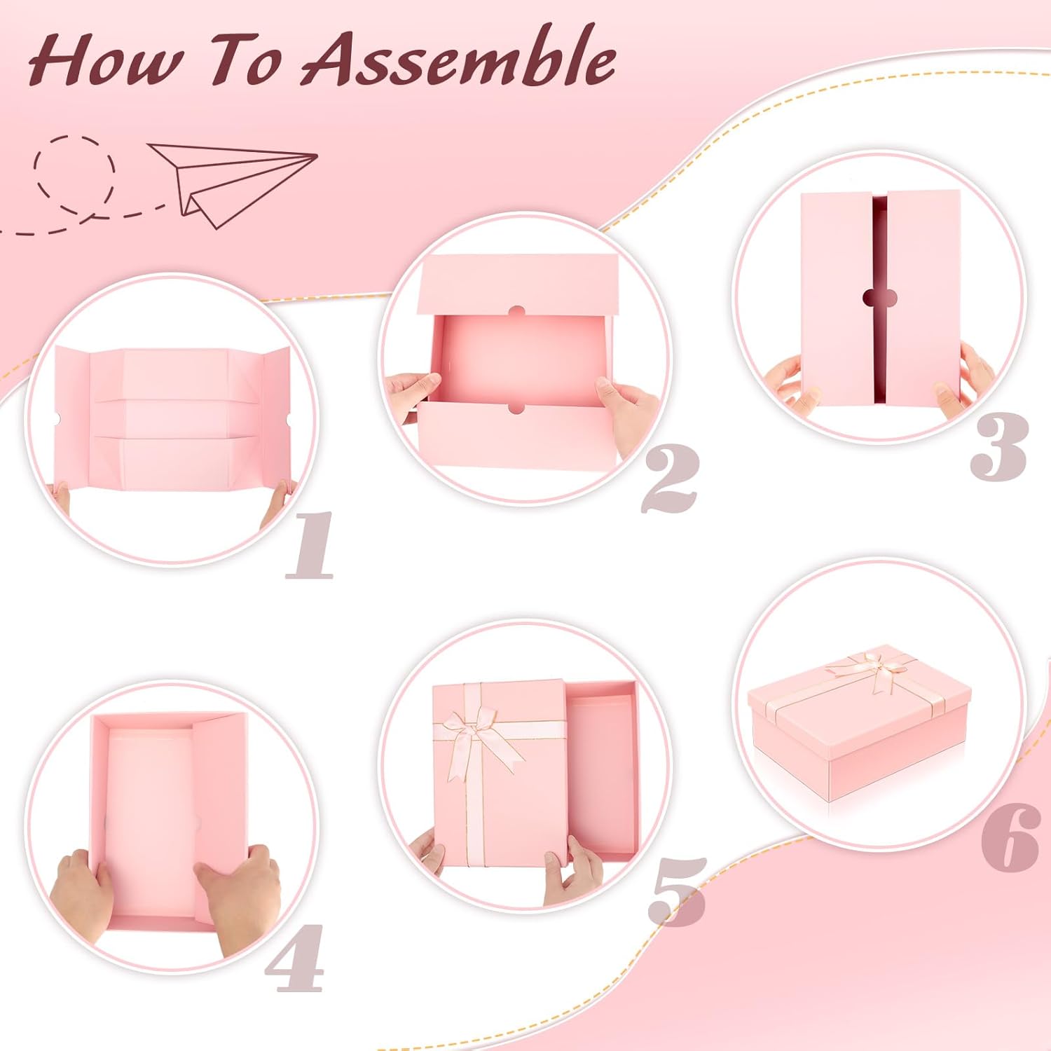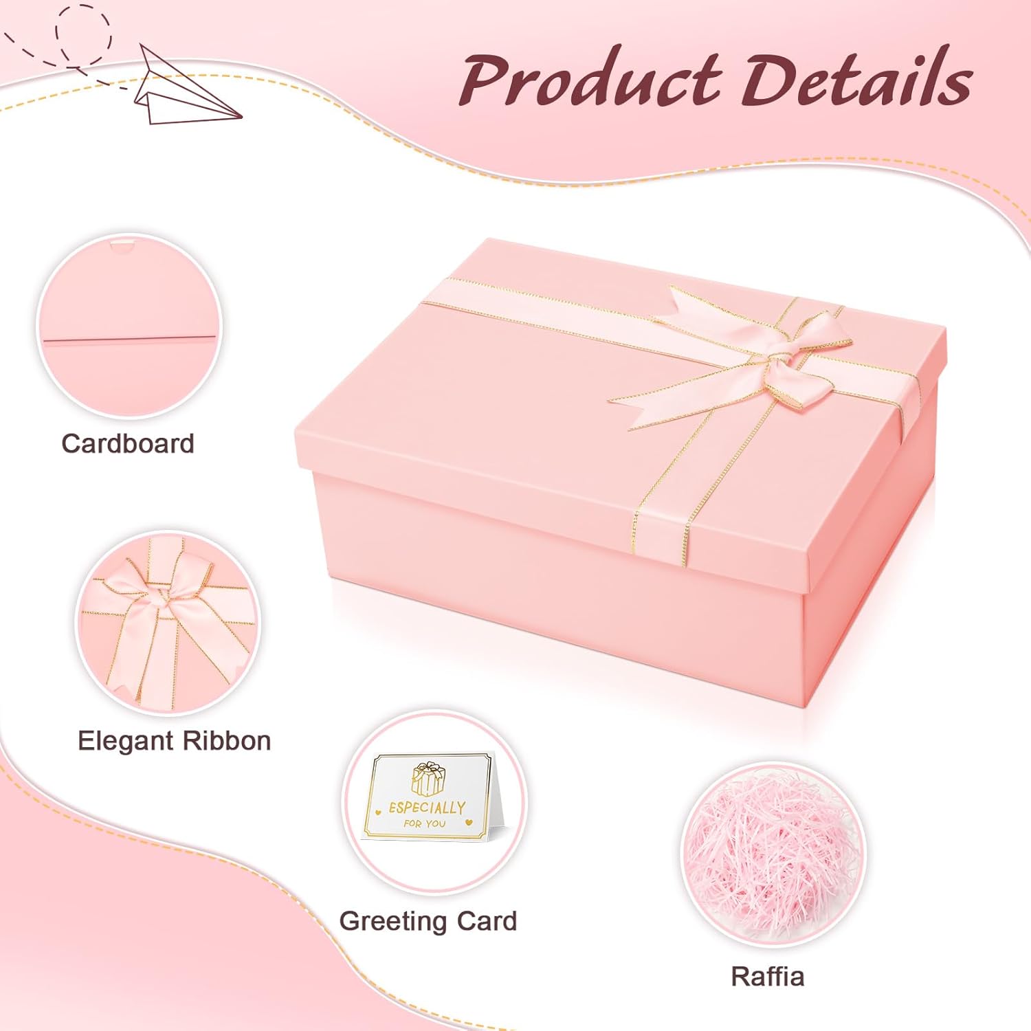 Geburtstags-Präsentkörbe – VINATO Geschenkbox mit Deckel 25 x 18 x 8,5 cm, faltbare Geschenkbox mit Deckel mit Schleife, Grußkarte & Bast, für Geburtstag, Valentinstag, Muttertag, Vatertag & Weihnachten, rosa