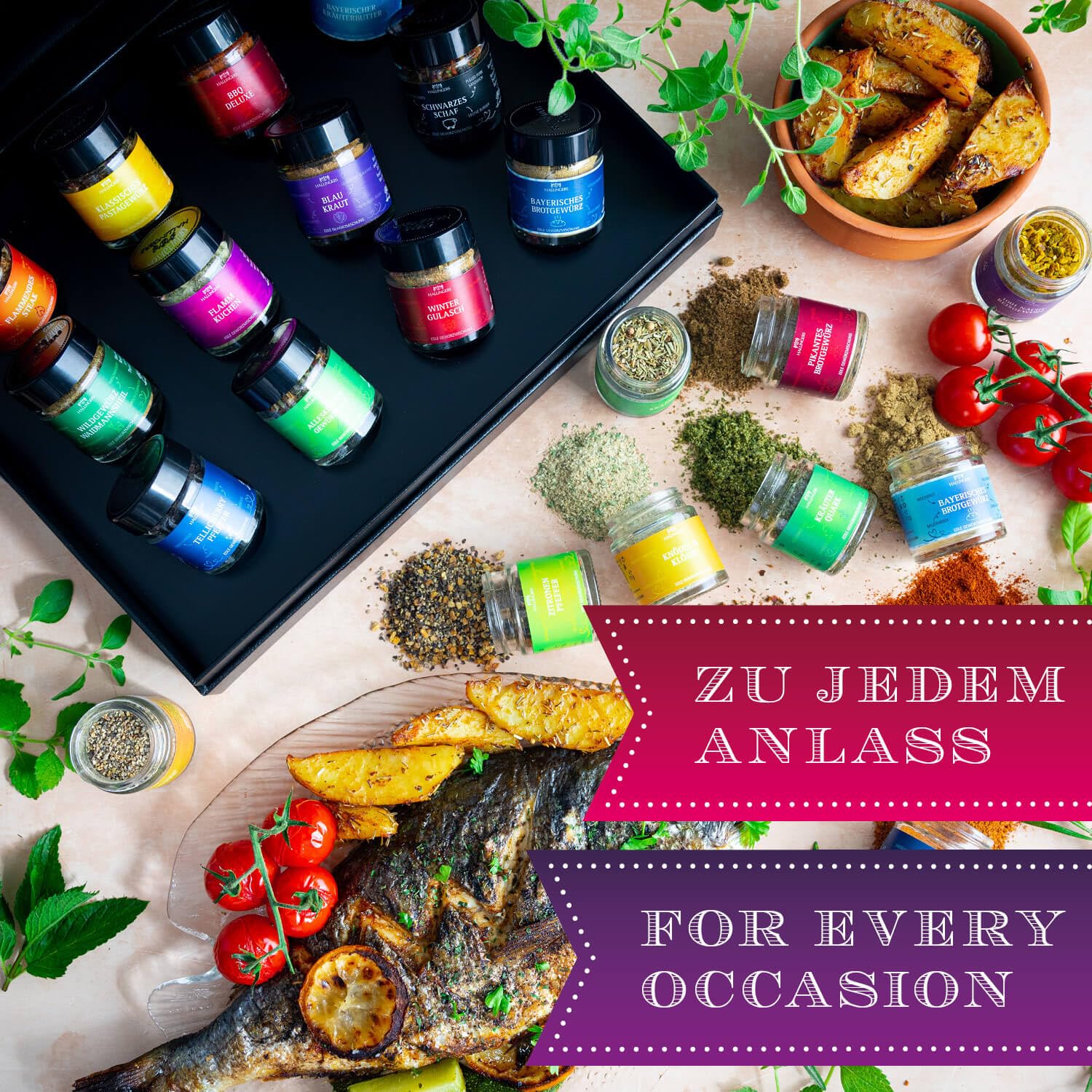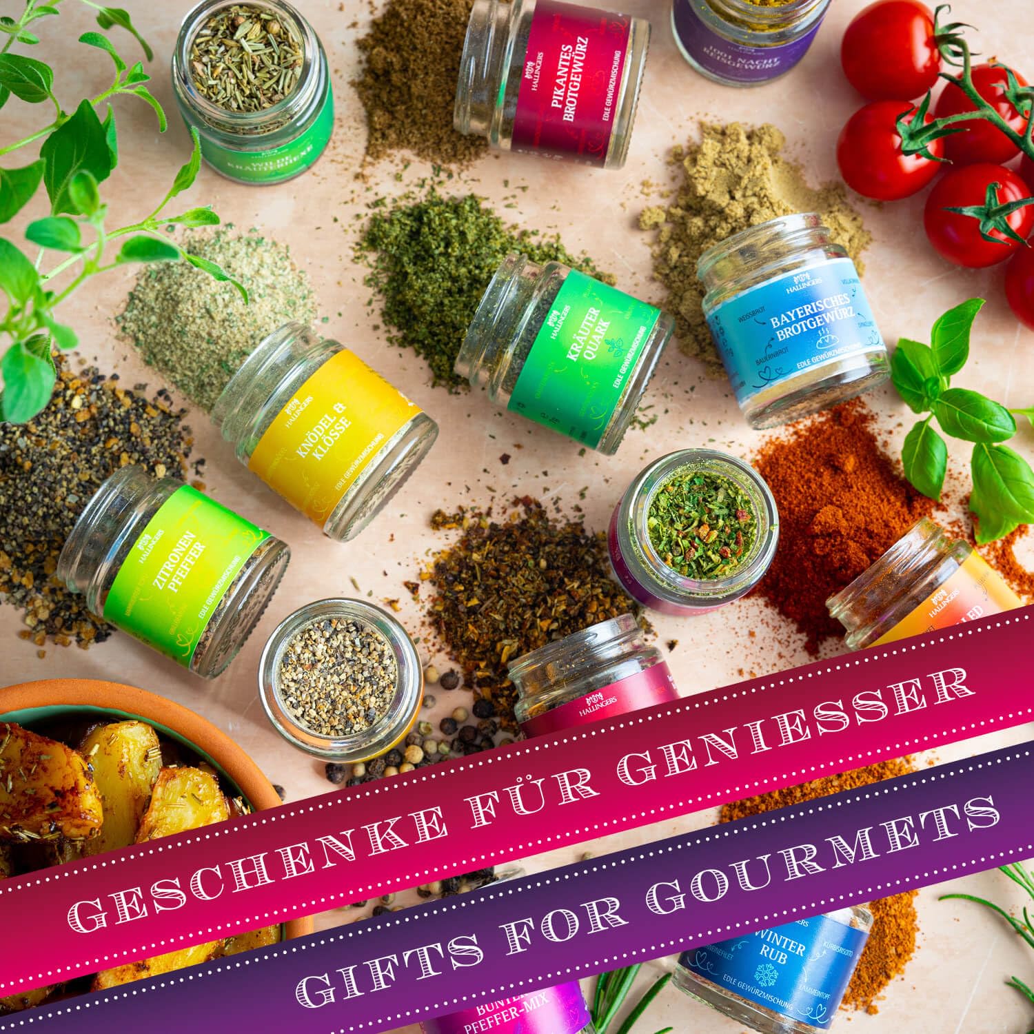 Wurst-Präsentkörbe – Hallingers Genuss Manufaktur Gewürz-Geschenkset – 12 Premium-Gewürze im Glas, edle Geschenkbox zum Kochen & Grillen, Gewürzset „Classic No. 1“, Geschenkidee für Männer, Geburtstag & Weihnachten