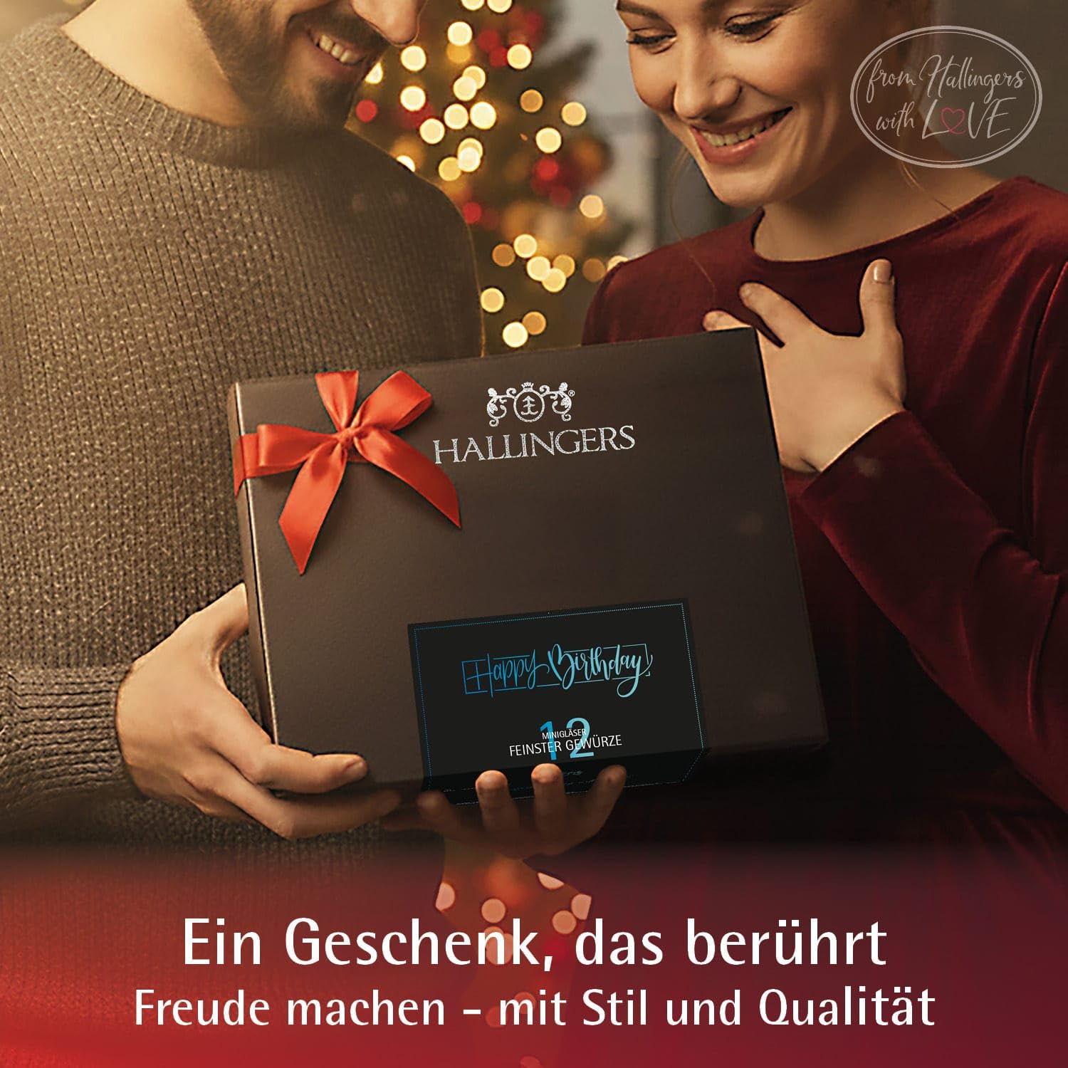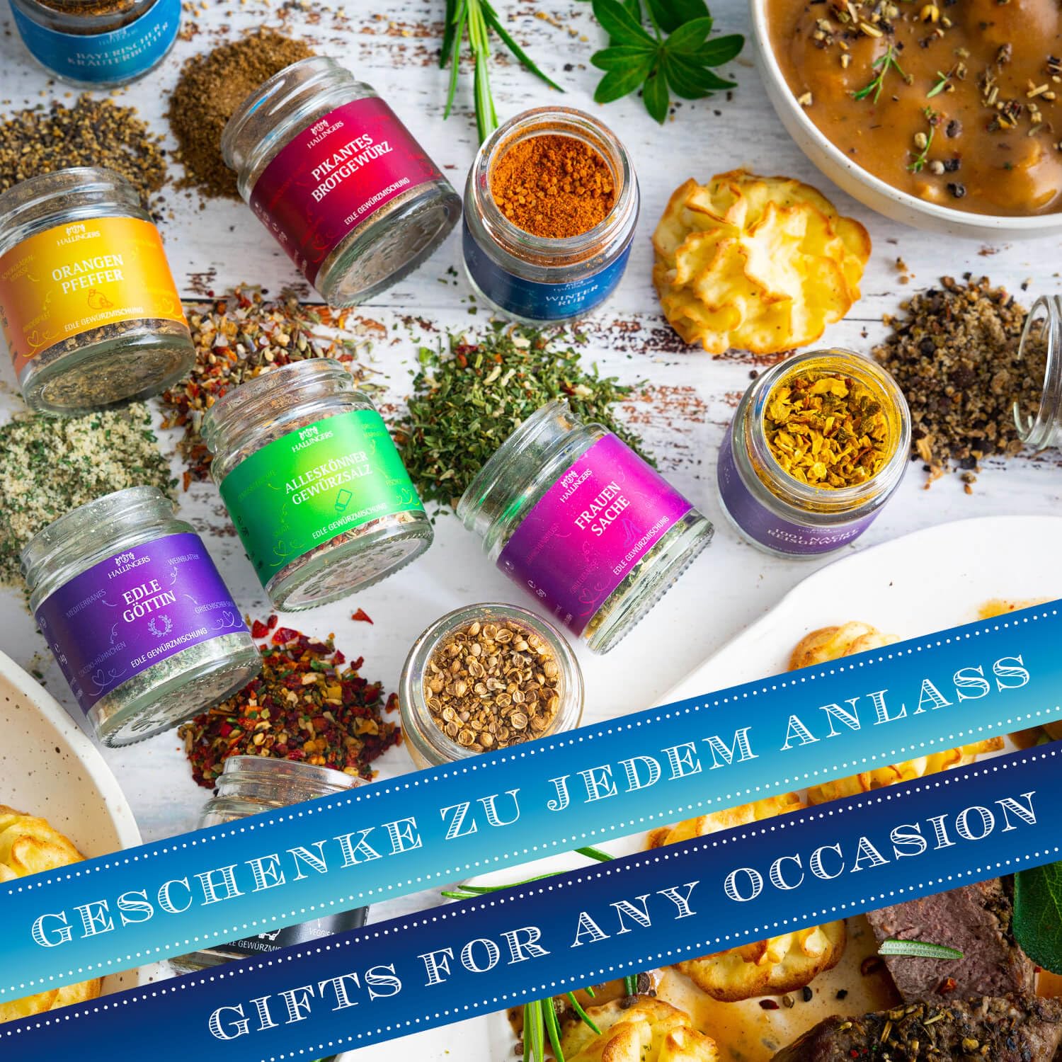 Wurst-Präsentkörbe – Hallingers Genuss Manufaktur Gewürz-Geschenkset Geburtstag – 12 Premium-Gewürze im Glas, edle Geschenkbox zum Kochen & Grillen, Gewürzset „Happy Birthday“, Geschenkidee für Männer, auch Weihnachten