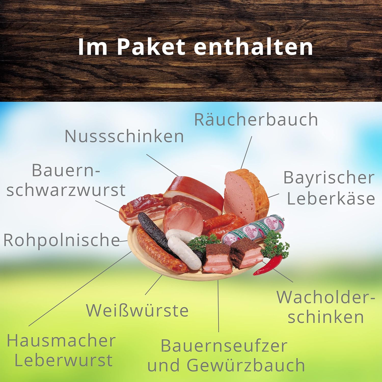 Wurst-Präsentkörbe – Landmetzgerei Schiessl Bayerisches Probierpaket 2,5 kg | Hausmannswurst, Leberkäse, Schinken, Salami, Speck | Glutenfrei und laktosefrei | Top-Qualität aus eigener Schlachtung als Geschenkset