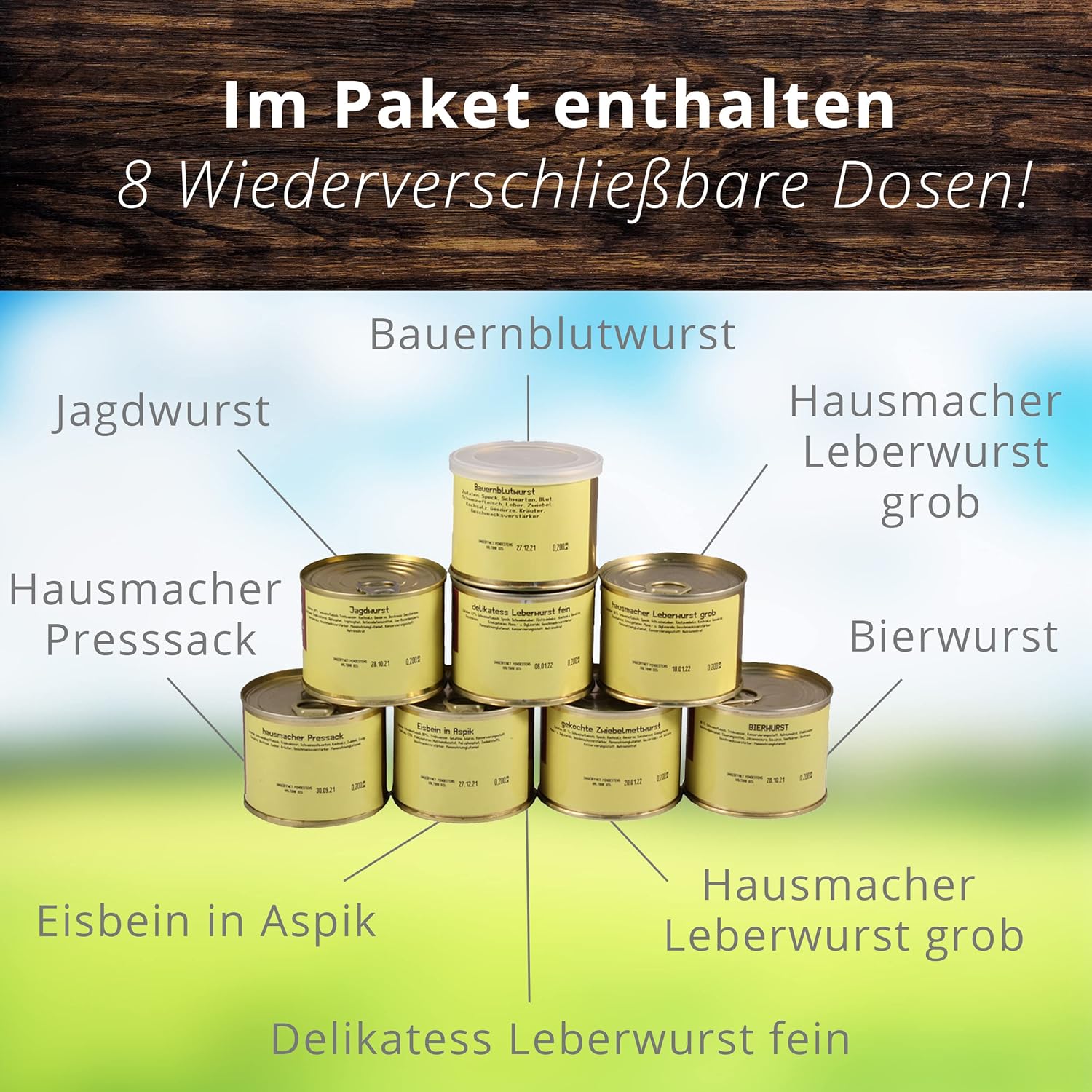 Wurst-Präsentkörbe – Mini-Dosen-Set mit 8 leckeren Wurstspezialitäten in der Dose Landmetzger Schiessl