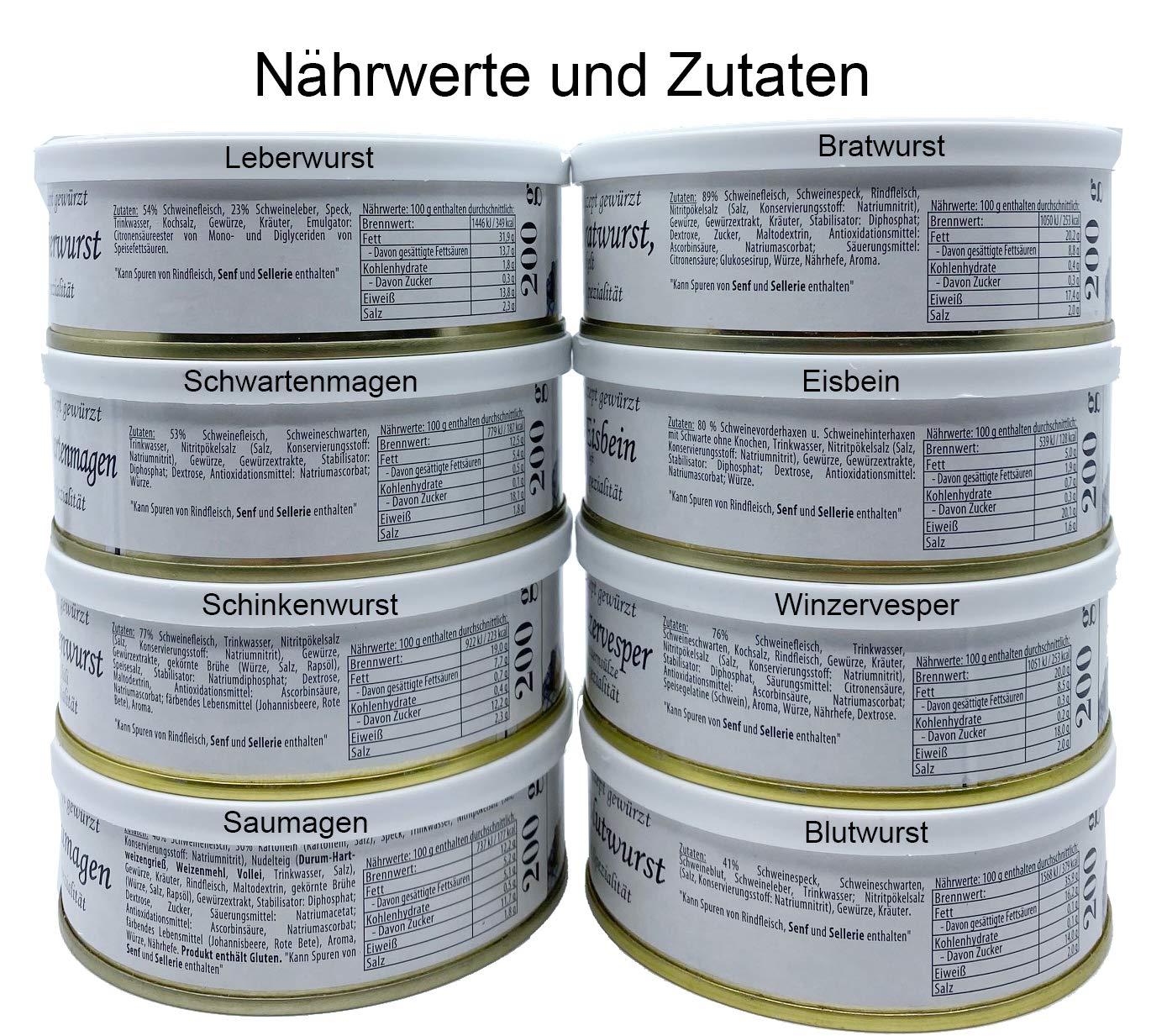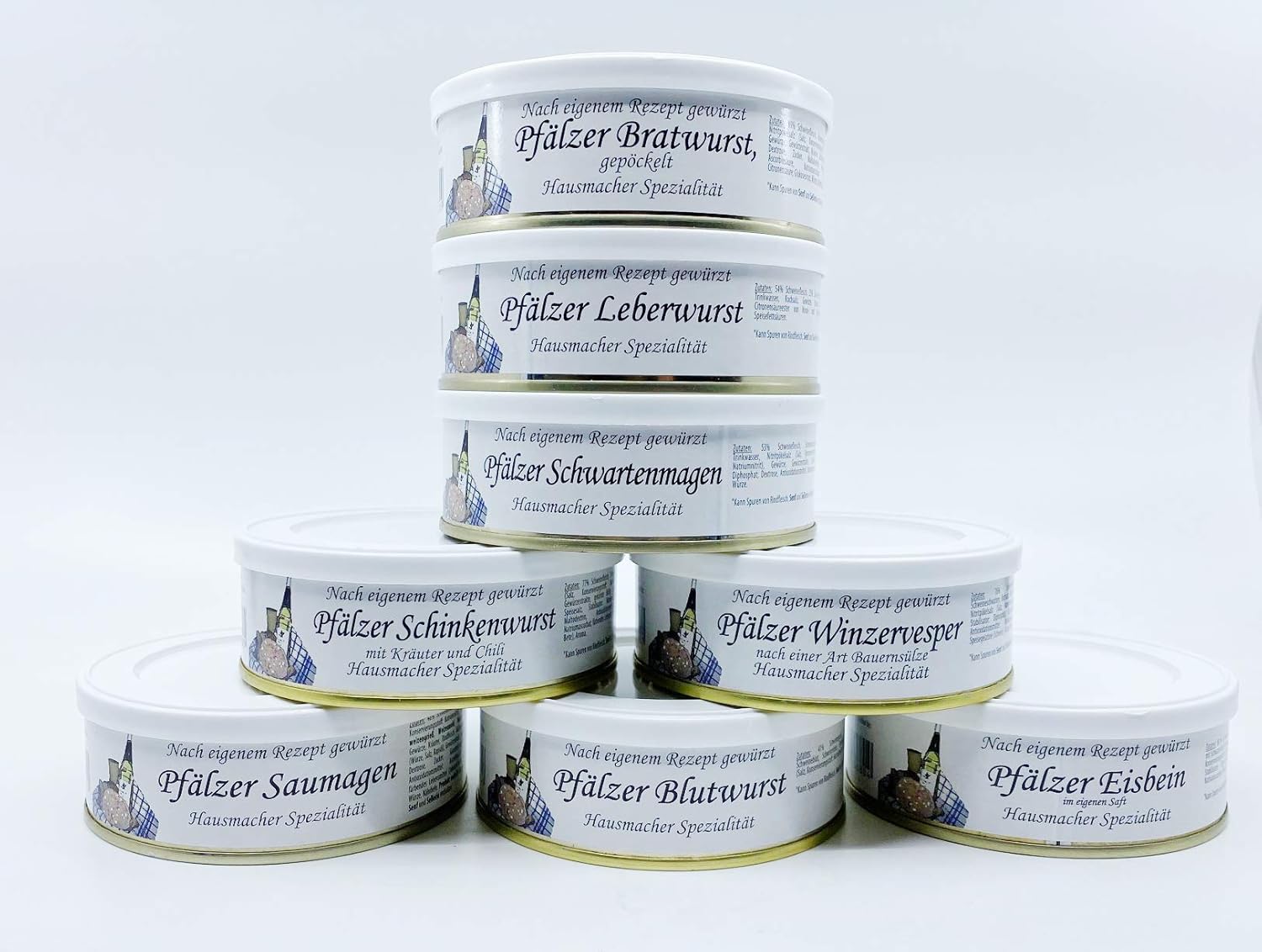 Wurst-Präsentkörbe – Pfälzer Wurstbox Wurstpaket Geschenkset im Netz – 8 verschiedene Dosen z.B. Leberwurst, Bratwurst, Eisbein, Saumagen, Blutwurst, Winezervesper, Schwartenstomen, Schinkenwurst (8 x 200 g)