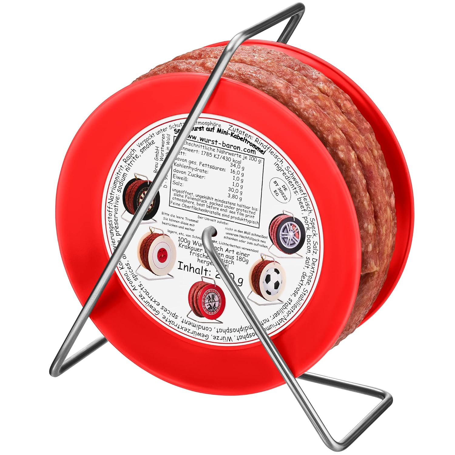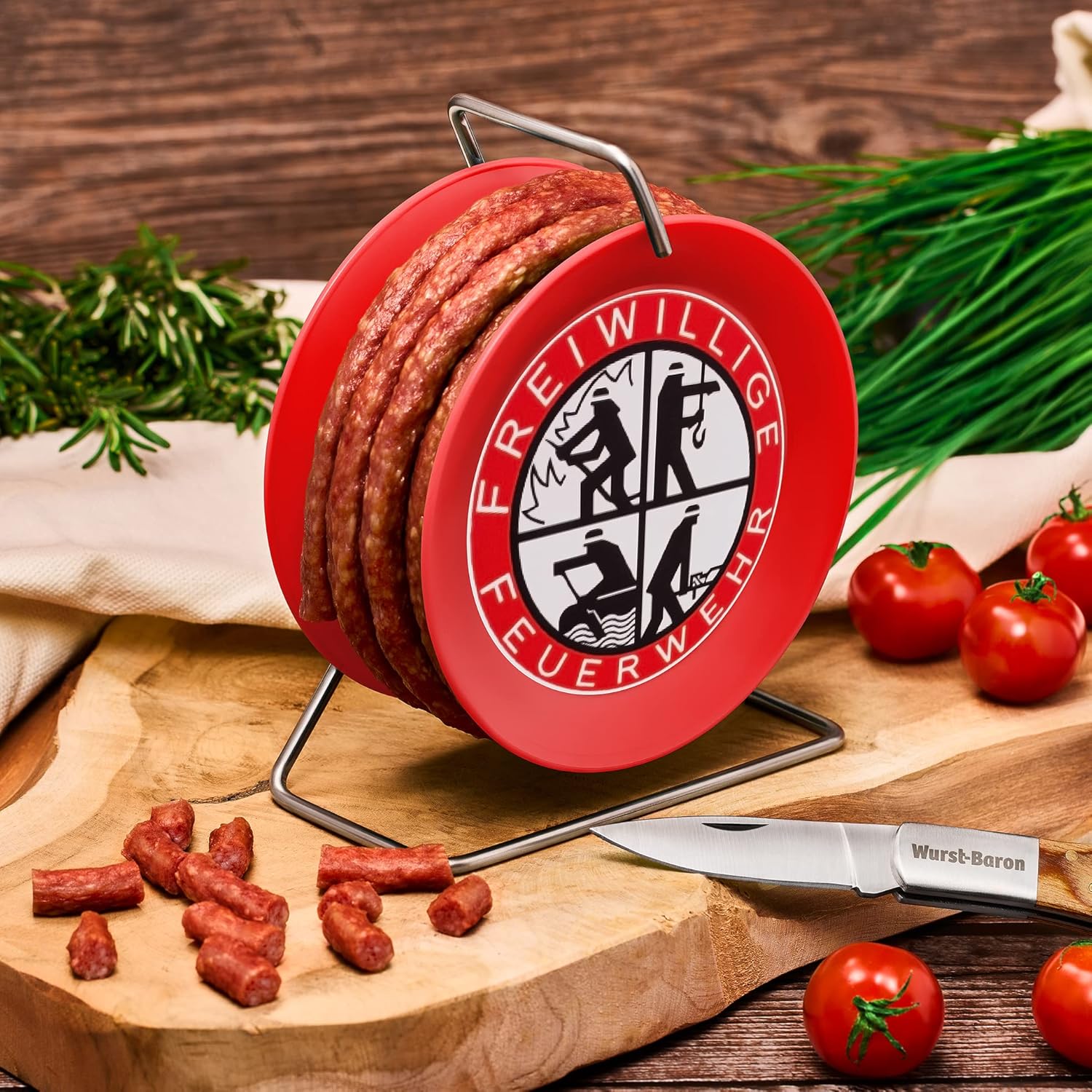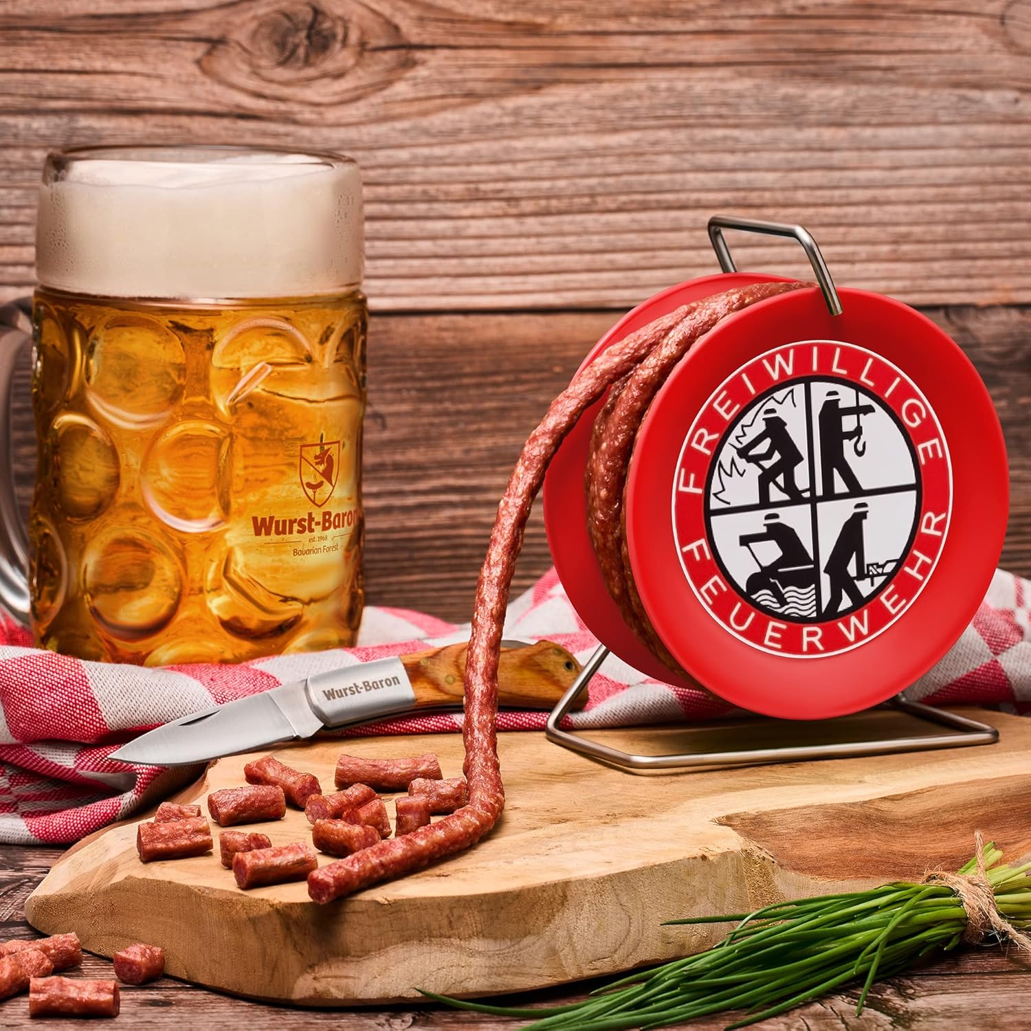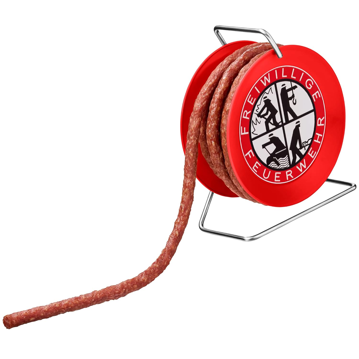 Wurst-Präsentkörbe – Wurstbaron® Salami auf Feuerwehrtrommel, Snackwurst, Mini-Kabeltrommel, Schlauchtrommel, Modell Freiwillige Feuerwehr, 3,5 m, Wurst nach Krakauer Art, 240 g
