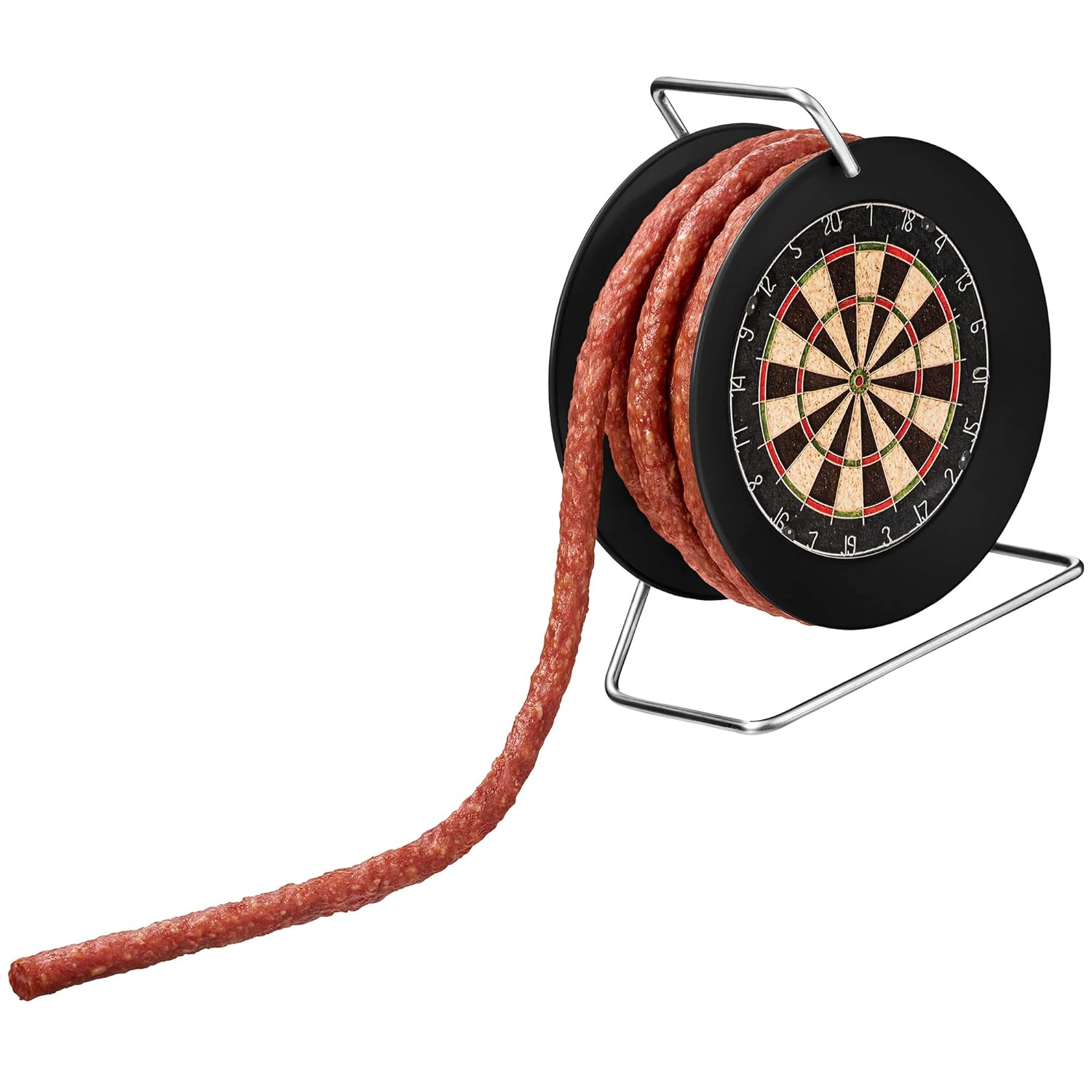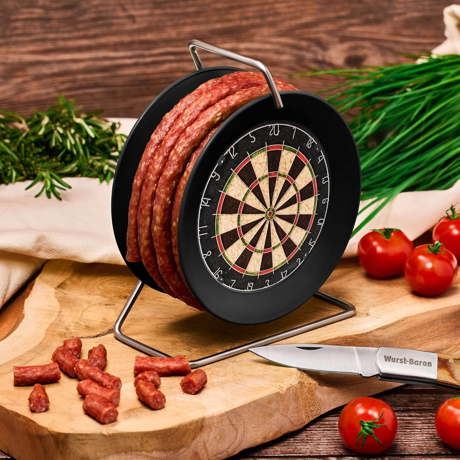 Wurst-Präsentkörbe – Wurstbaron® Wurstkabelrolle im Dartboard-Design, 3,5 m Wurst im Krakauer Stil, hochwertig und rauchiges Aroma, witziges Geschenk, 240 g