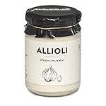 Allioli – Spanischer Knoblauchdip mit Sonnenblumenöl. Zutaten: Sonnenblumenöl (68%), EI, Knoblauch (7%), Zitronensaft, Salz, Säuerungsmittel (E-330), Aroma und natürliche Antioxidationsmittel (E-304, E-306). Enthält SULFITE. Nettogewicht: 135g. Hergestellt in Spanien von J.R. Suárez Monedero S.L., 16660 Las Pedroñeras, Cuenca. Kühl und trocken lagern. Nach dem Öffnen im Kühlschrank aufbewahren. Nährwertangaben (je 100 g): Energie 2515 kJ / 611 kcal, Fett 65,8g, davon gesättigte Fettsäuren 6,8g, Kohlenhydrate 3,3g, davon Zucker 0,6g, Eiweiß 1,4g, Salz 1,6g.