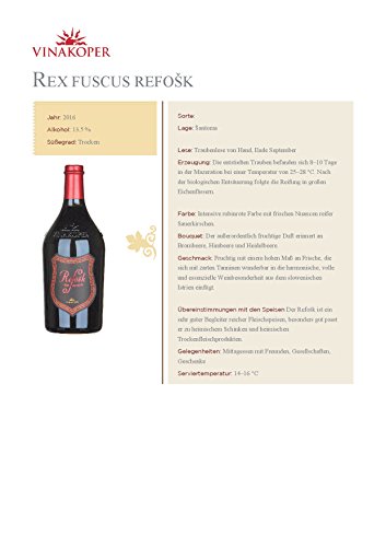 1 Flasche Refošk REX Fuscus 0,75 lt von Vinakoper. Die entstielten Trauben befanden sich 8–10 Tage in der Mazeration bei einer Temperatur von 25–28 °C. Nach der biologischen Entsäuerung folgte die Reifung in großen Eichenfässern. Bouquet: Der außerordentlich fruchtige Duft erinnert an Brombeere, Himbeere und Heidelbeere.