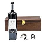 Das exklusive Rotwein Geschenkset für Genießer. Das Weinpräsent ist nicht nur optisch ein Hingucker, sondern auch Geschmacklich ein wahres Vergnügen. Damit ist Freude beim verschenken garantiert. Marques de Castilla Reserva 0,75 l. Der Rotwein überzeugt durch seine feinen Aromen und intensivem Geschmack. Eindrucksvolle Holzkiste mit edler Holz / Gold Optik. Perfekt geeignet zum verschenken. Kellnermesser aus Edelstahl mit Kunststoffgriff, Korkenzieher, Folienschneider und Korkenheber. Kapselschneider mit Edelstahlklingen zum entfernen der Folien und Kappen von Weinflaschen.