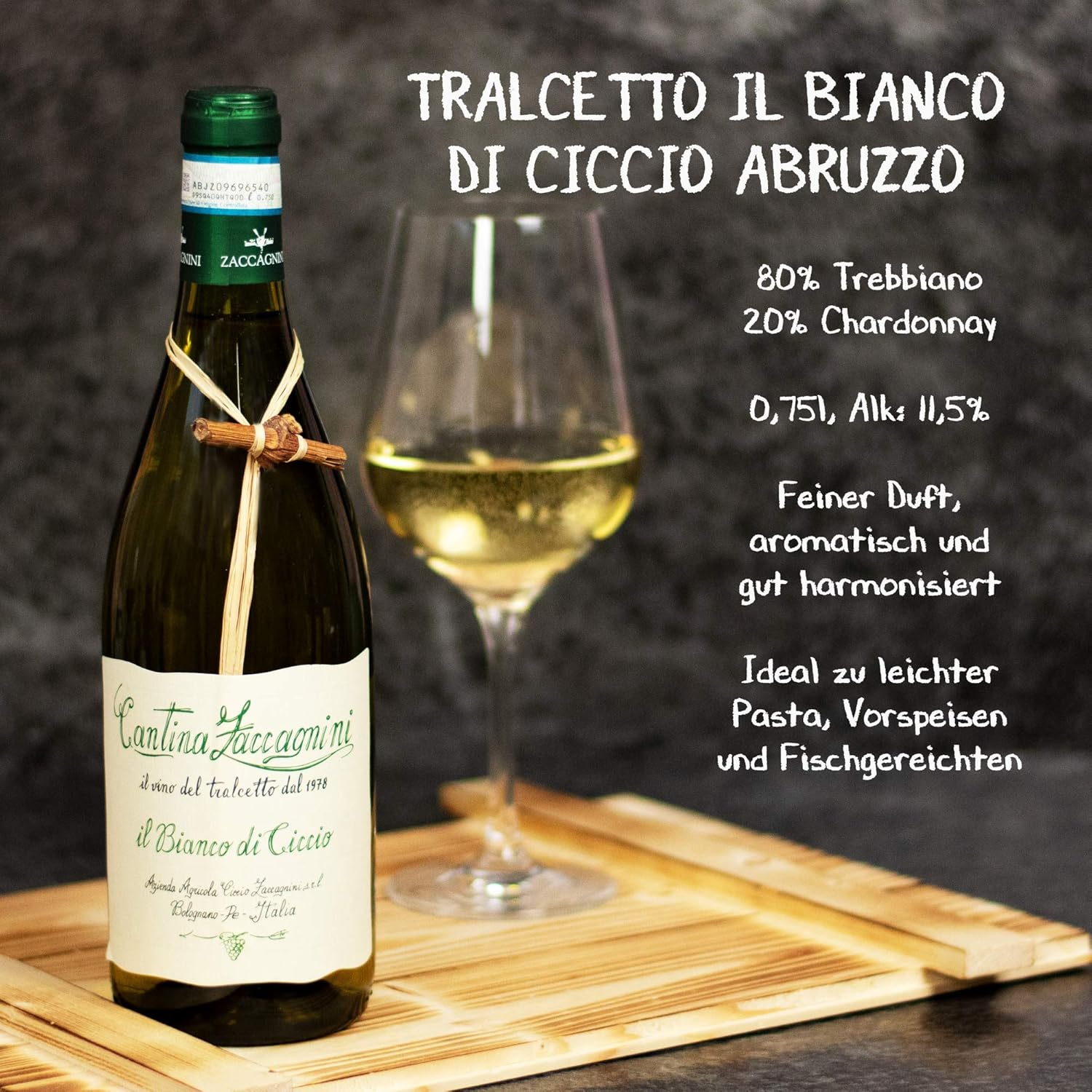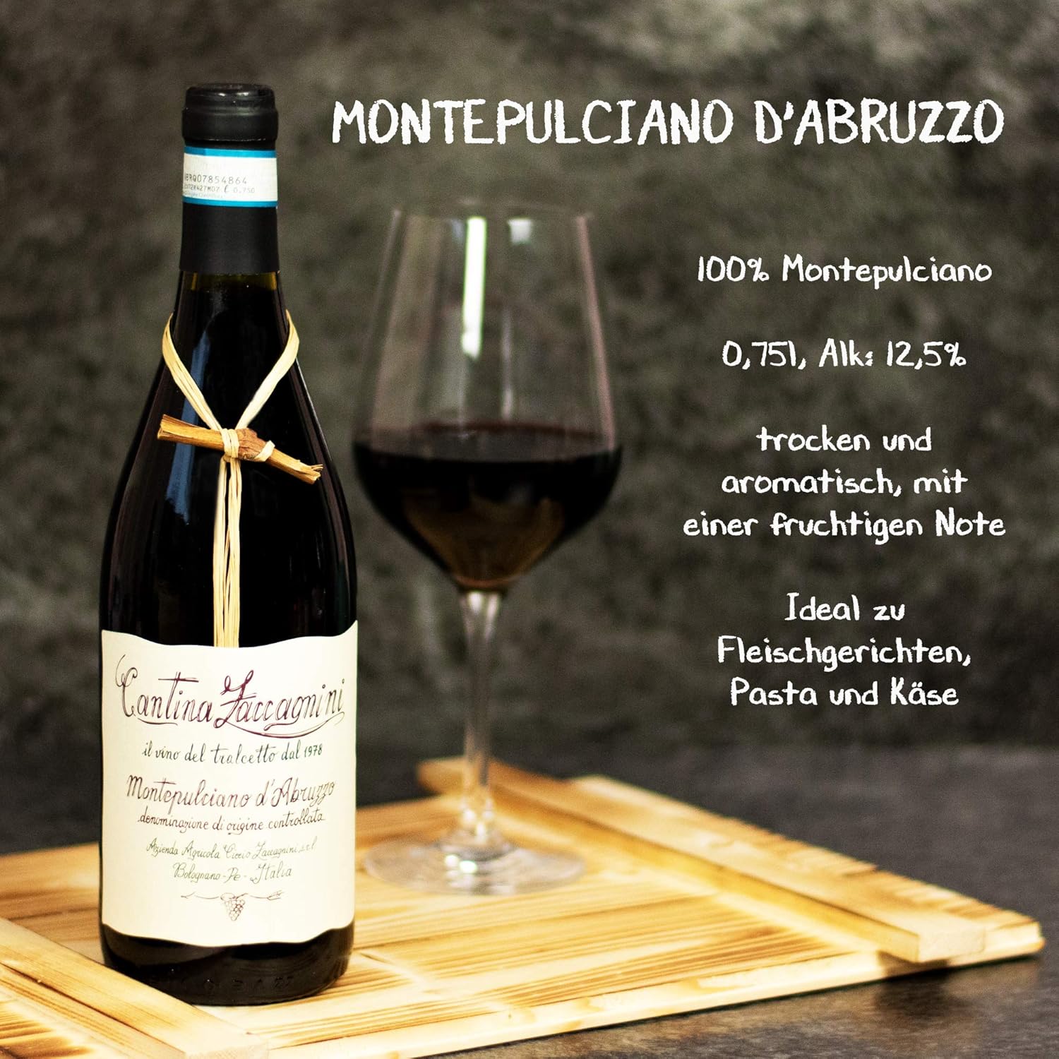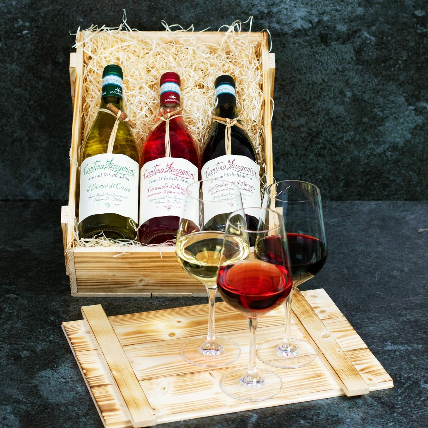 Geflammter Geschenkkorb aus Holz gefüllt mit 3 Flaschen Wein von Zaccagnini aus Italien. Inhalt: Rotwein Montepulciano d’Abruzzo 0,75 l, Roséwein Cerasuolo d’Abruzzo 0,75 l, Weißwein il Bianco di Ciccio 0,75 l
