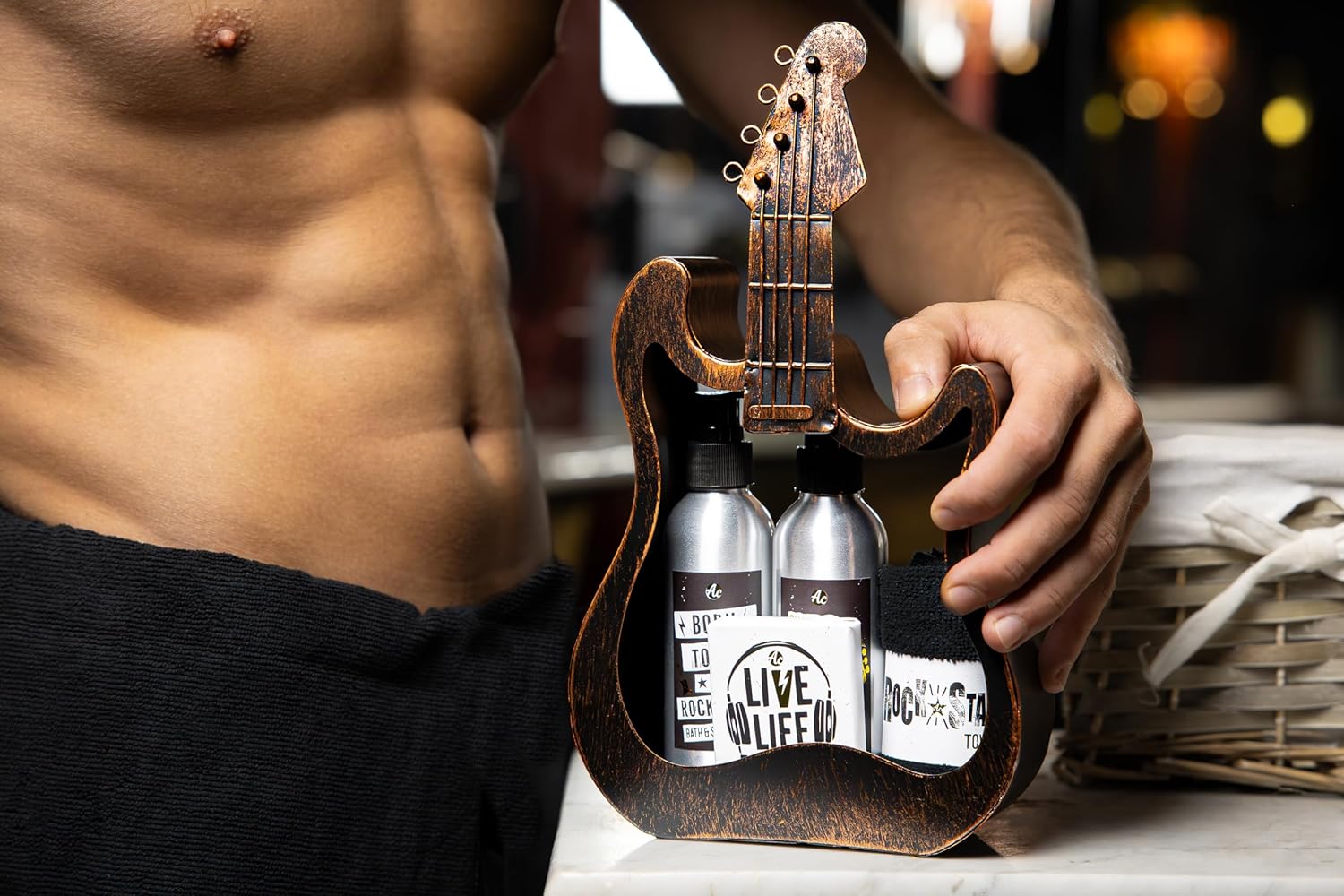 Wein-Präsentkörbe – Accentra Rockstar Geschenkset, Pflegeset in Metallgitarre in Braun mit Duschgel, Shampoo, Seife und Handtuch, als besondere rockige Geschenkidee zum Geburtstag, Vatertag, Muttertag und Weihnachten