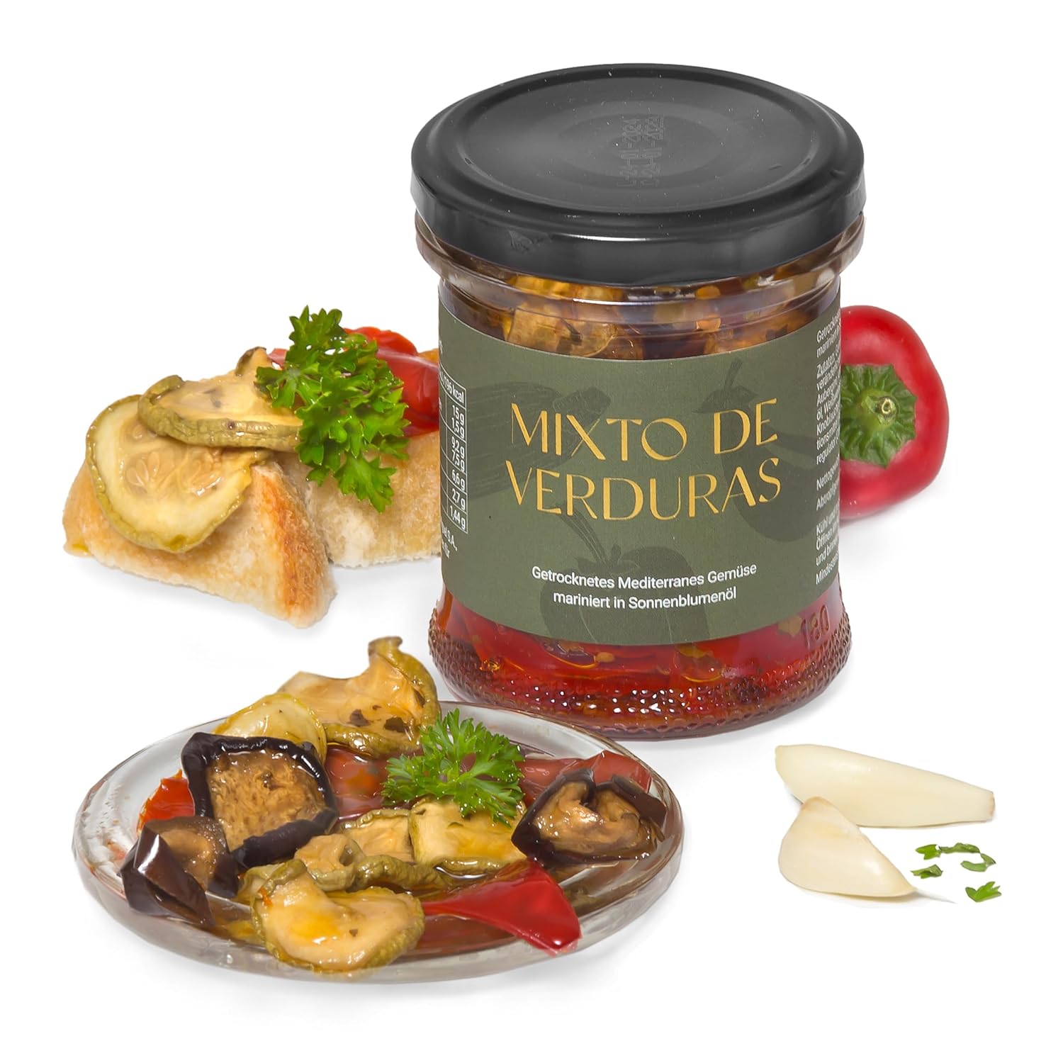 Sonnengereiftes, mediterranes Gemüse (Aubergine, Paprika, Zucchini), sorgsam getrocknet und in einer Sonnenblumenöl-Marinade eingelegt. Vegetarisches Antipasti-Gericht aus der Region Rioja in Spanien. 100% natürliche Zutaten, ohne Konservierungsstoffe.