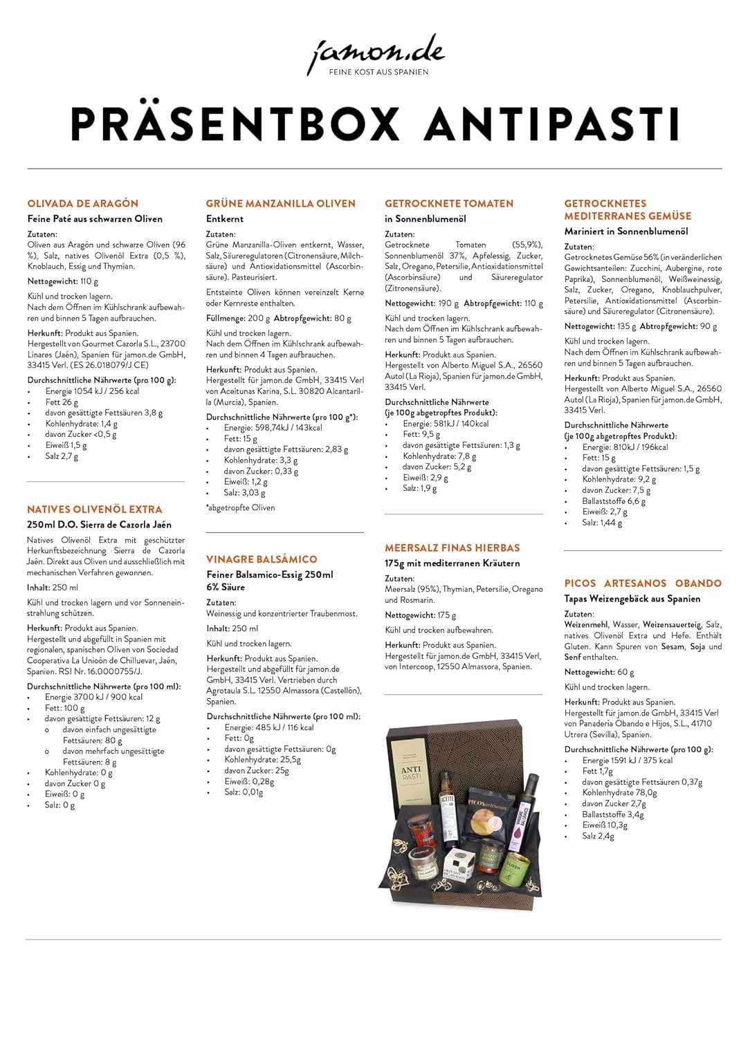 Sämtliche im Präsent enthaltenen Produkte sind Originalimporte und stammen aus dem Ursprungsland Spanien. Die Präsentboxen werden in Deutschland zusammengestellt und dekoriert und von unserem Firmenstandort in Nordrhein-Westfalen aus versandt.