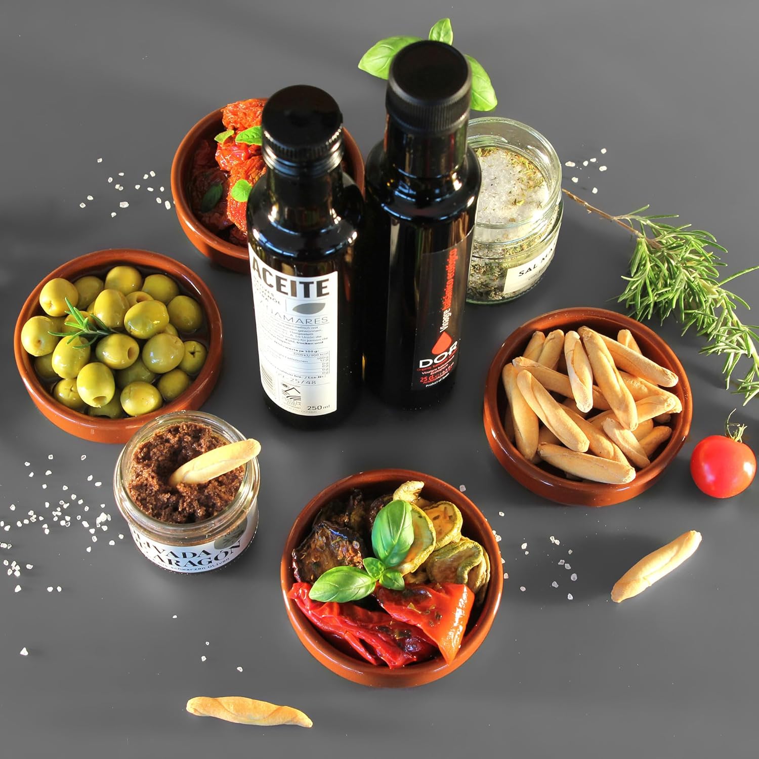 A pure variety of extra virgin olive oil with protected origin D.O. Sierra de Cazorla, a fine balsamic vinegar and a sea salt with Mediterranean herbs complete the lucullic journey.