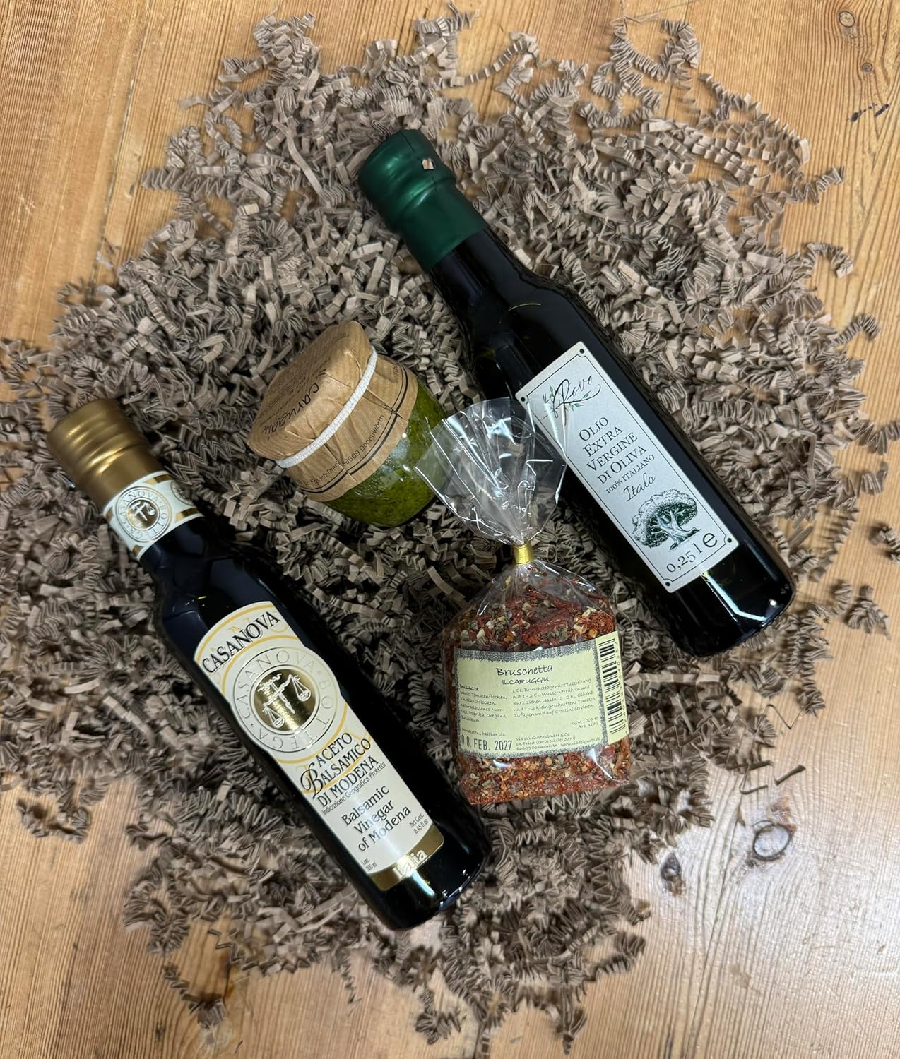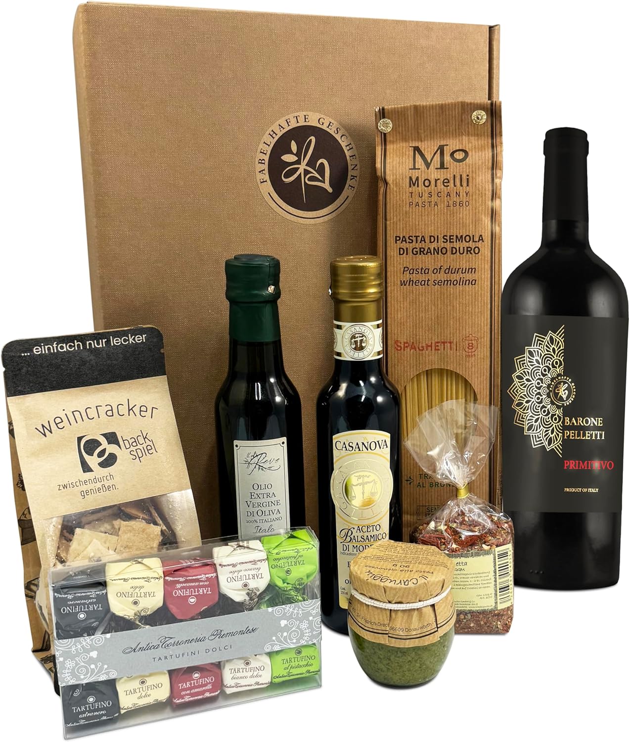 Das Geschenkset enthält einen fruchtigen Rotwein (Primitivo) aus Apulien, hochwertige Spaghetti von Morelli, aromatisches Pesto alla Genovese, natives Olivenöl extra, Aceto Balsamico di Modena, Weincracker und köstliche Tartufini.