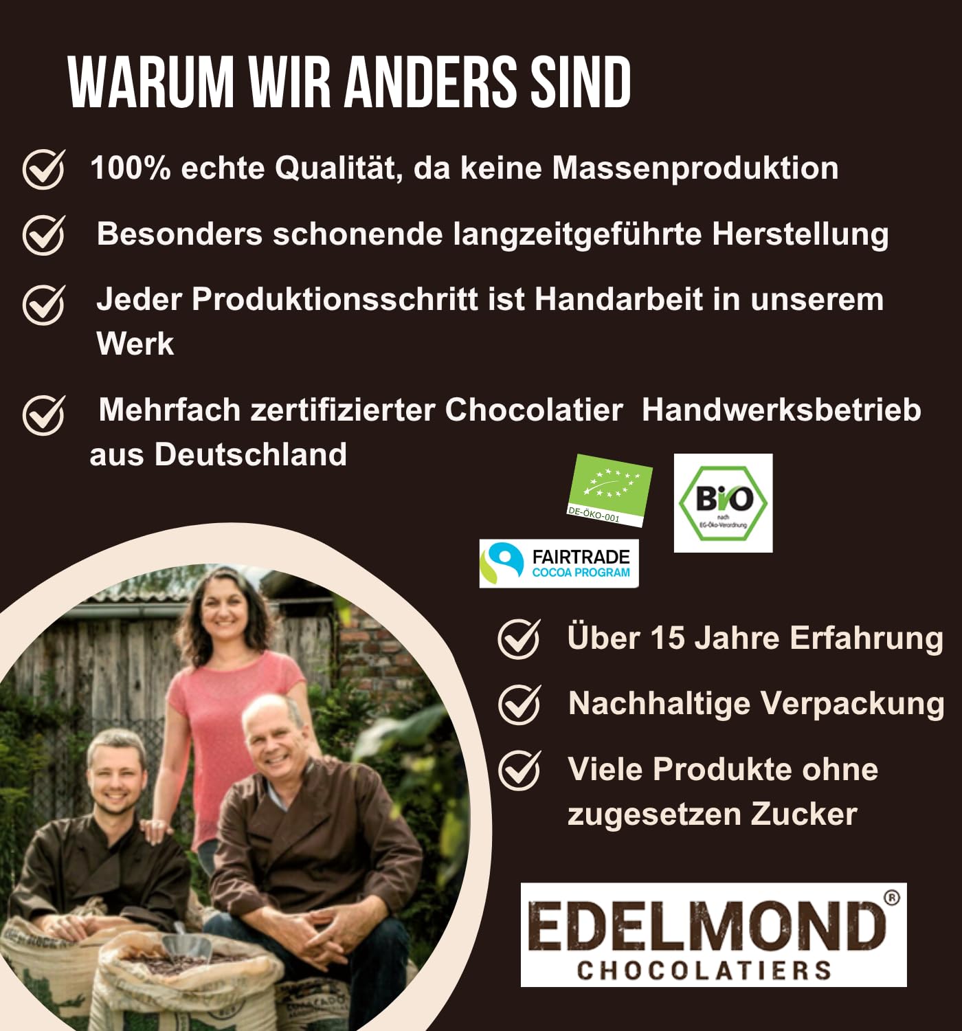 GARANTIERT NIEDRIGER CADMIUMGEHALT FÜR SICHEREN GENUSS Jede Charge wird auf Cadmium getestet – mit Ergebnissen, die mindestens 50 % unter dem gesetzlich zulässigen EU-Grenzwert liegen. Dies vereint Genuss mit gesundheitlicher Unbedenklichkeit – ein Qualitätsmerkmal von Edelmond.