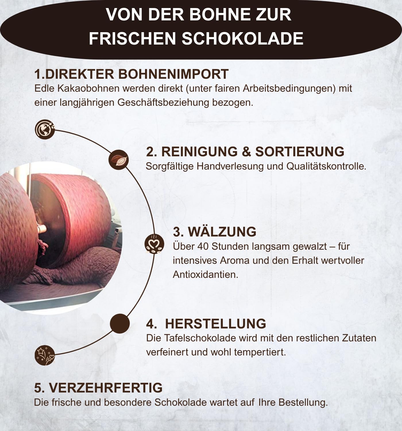 Traditionelle Handwerkskunst aus CRIOLLO-Bohnen Edelmond verarbeitet seltene Criollo-Kakaobohnen in über 45 Stunden Langzeitwalzen – ohne Emulgatoren oder künstliche Zusatzstoffe. Das Ergebnis ist ein besonders voller und harmonischer Schokoladengeschmack, wie man ihn nur aus echter Handwerkskunst kennt.