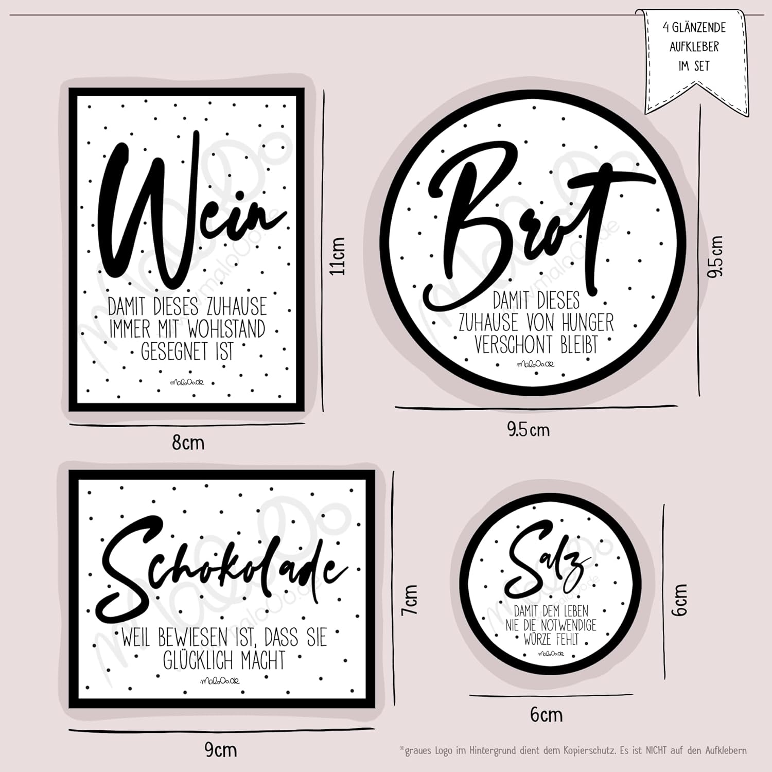 Mit diesem modernen Einweihungsgeschenk-Aufkleberset von maloOo Geschenke verzieren Sie das traditionelle Brot- und Salzgeschenk zur Einweihung im Handumdrehen. So wird der Geschenkkorb mit Sicherheit ein Hingucker und das Einweihungsgeschenk wird den Beschenkten viel Freude bereiten.