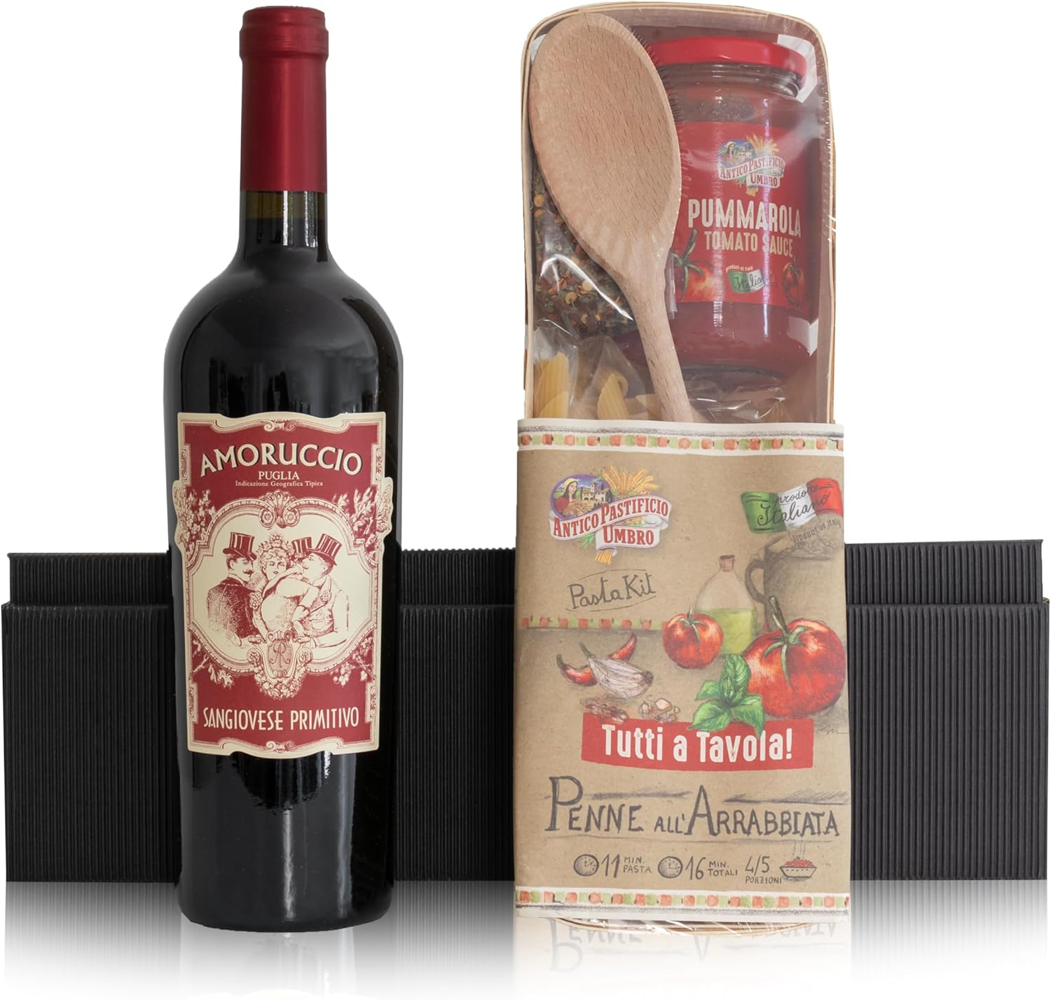 Entdecken Sie die köstliche Welt Italiens mit unserem exquisiten Geschenkpaket. Dieses sorgfältig zusammengestellte Paket bietet ein authentisches kulinarisches Erlebnis, das Ihre Sinne verwöhnt und Ihren Gaumen verzaubert. Inhalt der Geschenkpackung: Wein Amoruccio Sangiovese Primitivo (750 ml): Erleben Sie den einzigartigen Geschmack des Weins Amoruccio Sangiovese Primitivo, der durch seine tiefen Aromen von dunklen Beeren und dezenten Gewürznoten überzeugt. Ein Wein, der in jedem Schluck die italienische Weintradition widerspiegelt. Penne Rigate (400 g): Die Penne Rigate sind die perfekte Beilage zu verschiedenen Saucen. Ihre einzigartige Rillenstruktur sorgt dafür, dass die Aromen optimal aufgenommen werden und ein authentisches Pasta-Erlebnis entsteht. Pummorala (280 g): Unsere Pummorala-Tomatensauce verleiht Ihren Gerichten einen sonnenverwöhnten Geschmack. Verwenden Sie sie als Basis für Ihre Kreationen oder als köstliche Ergänzung zu Nudelgerichten. Preparato Spezie Arrabbiata (30 g): Mit unserer Gewürzmischung zaubern Sie im Handumdrehen den unverwechselbaren Geschmack italienischer Arrabbiata-Sauce. Verleihen Sie Ihren Gerichten eine würzige Note, die Ihren Gaumen erfreuen wird. ️ KOCHLÖFFEL AUS HOLZ Unser hochwertiger Kochlöffel aus Holz ist das ideale Werkzeug für die Zubereitung Ihrer kulinarischen Meisterwerke. Mit Liebe zum Detail gefertigt, um Ihnen ein authentisches Kocherlebnis zu bieten. Erleben Sie die Faszination italienischer Aromen und Zutaten mit unserem Geschenkpaket. Perfekt als Geschenk für Genießer, Hobbyköche oder als besondere Freude für sich selbst. Bestellen Sie noch heute und tauchen Sie ein in die kulinarische Welt Italiens!
