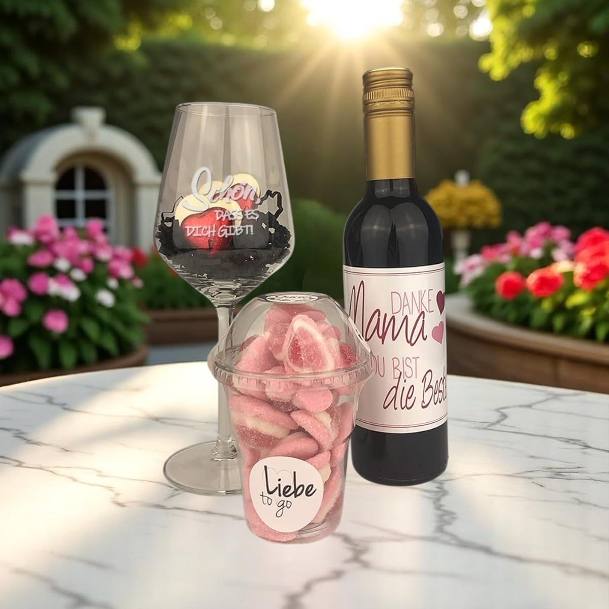 Wein-Präsentkörbe – Geschenk für Mama – Wein – persönliches Geschenk – graviertes Weinglas – Muttertag – Marshmallows – Geschenkkorb