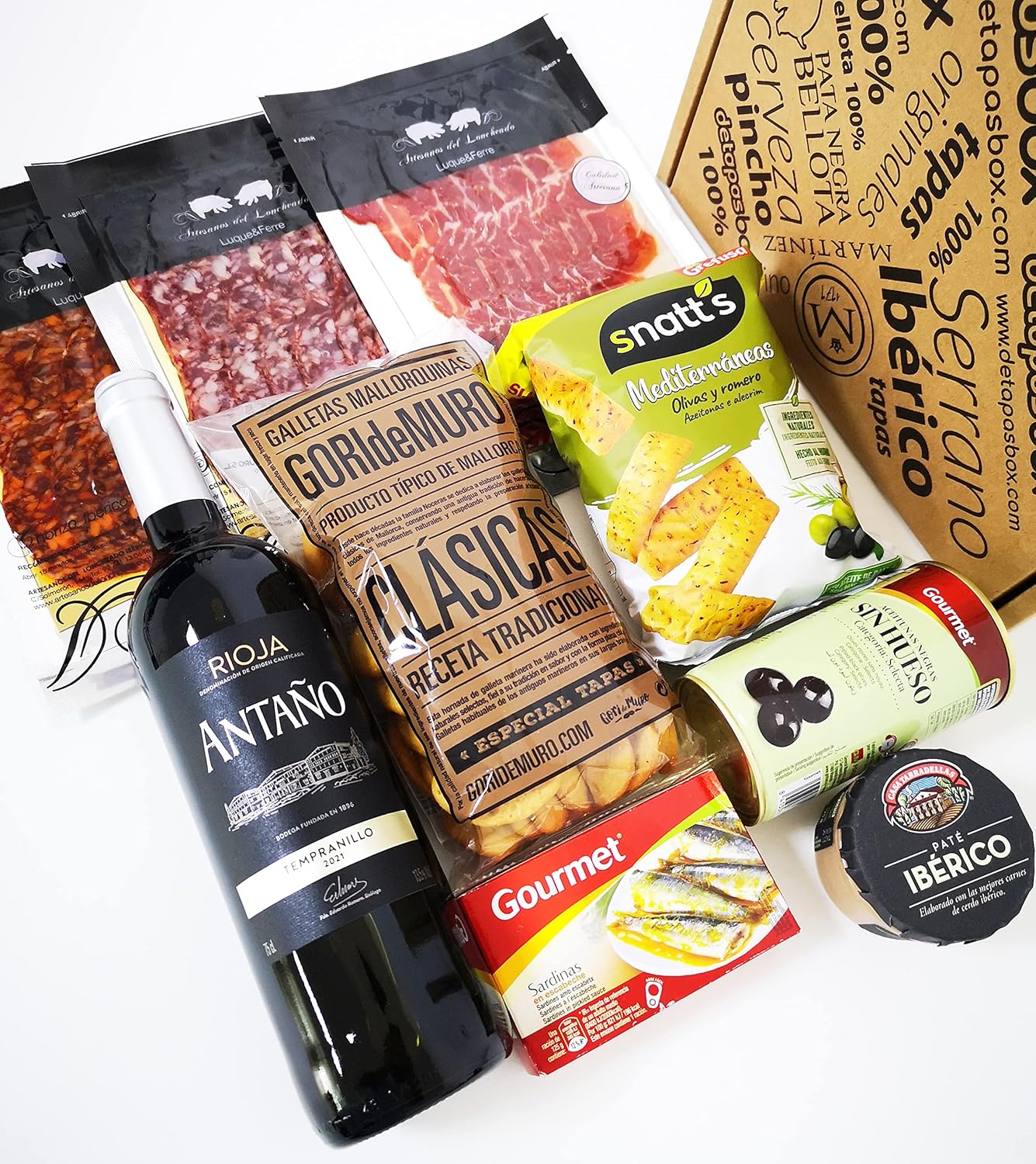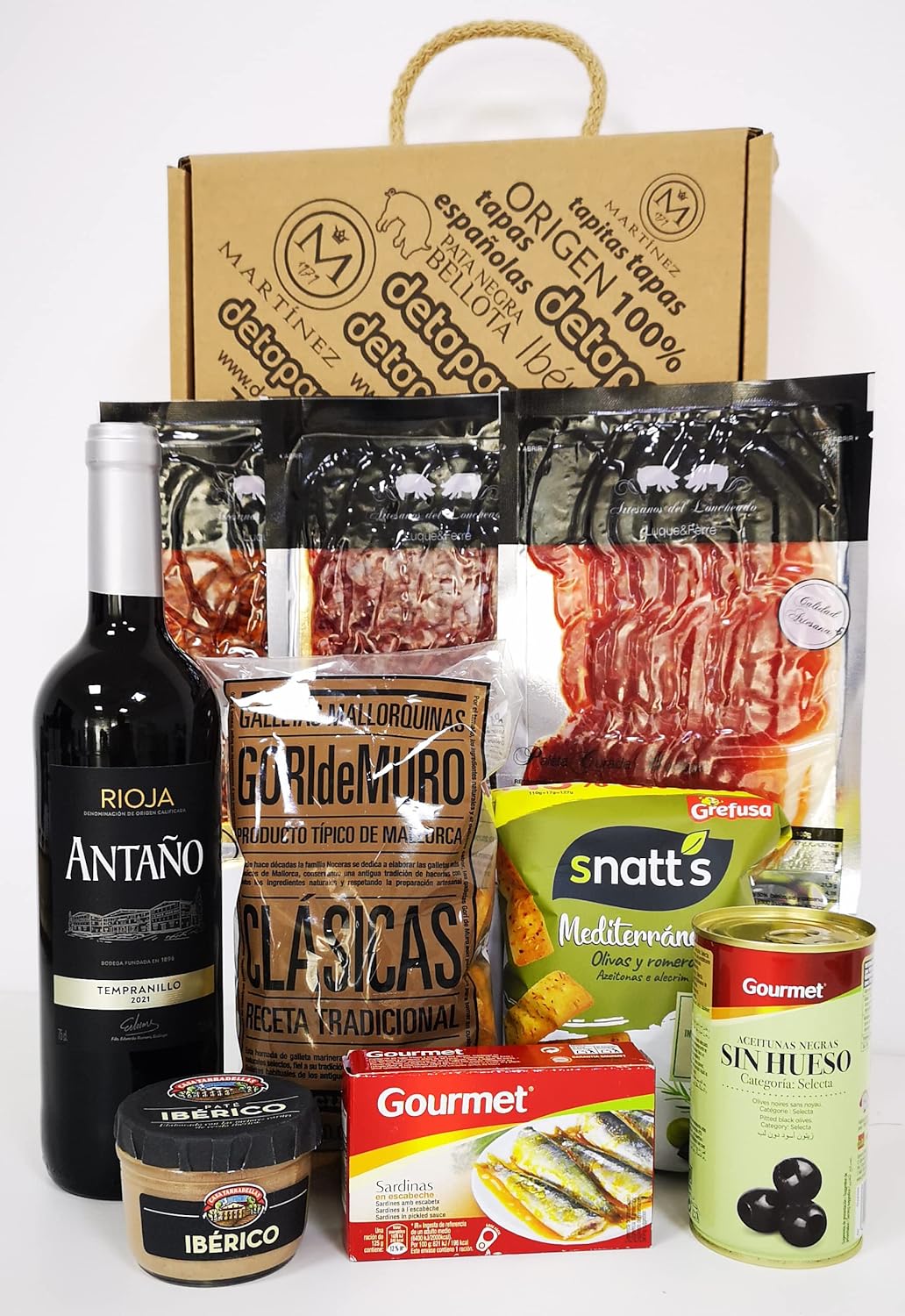 1 x Rotwein Rioja 75cl 12,5% vol. Heller Rotwein, 1 x Sardinen, mariniert 120 g, 1 x Ibérico Pate Tarradellas, 1 x Snatt’s Oliven und Rosmarin, 1 x Oliven (Hojiblanca ohne Kerne) 150 g.