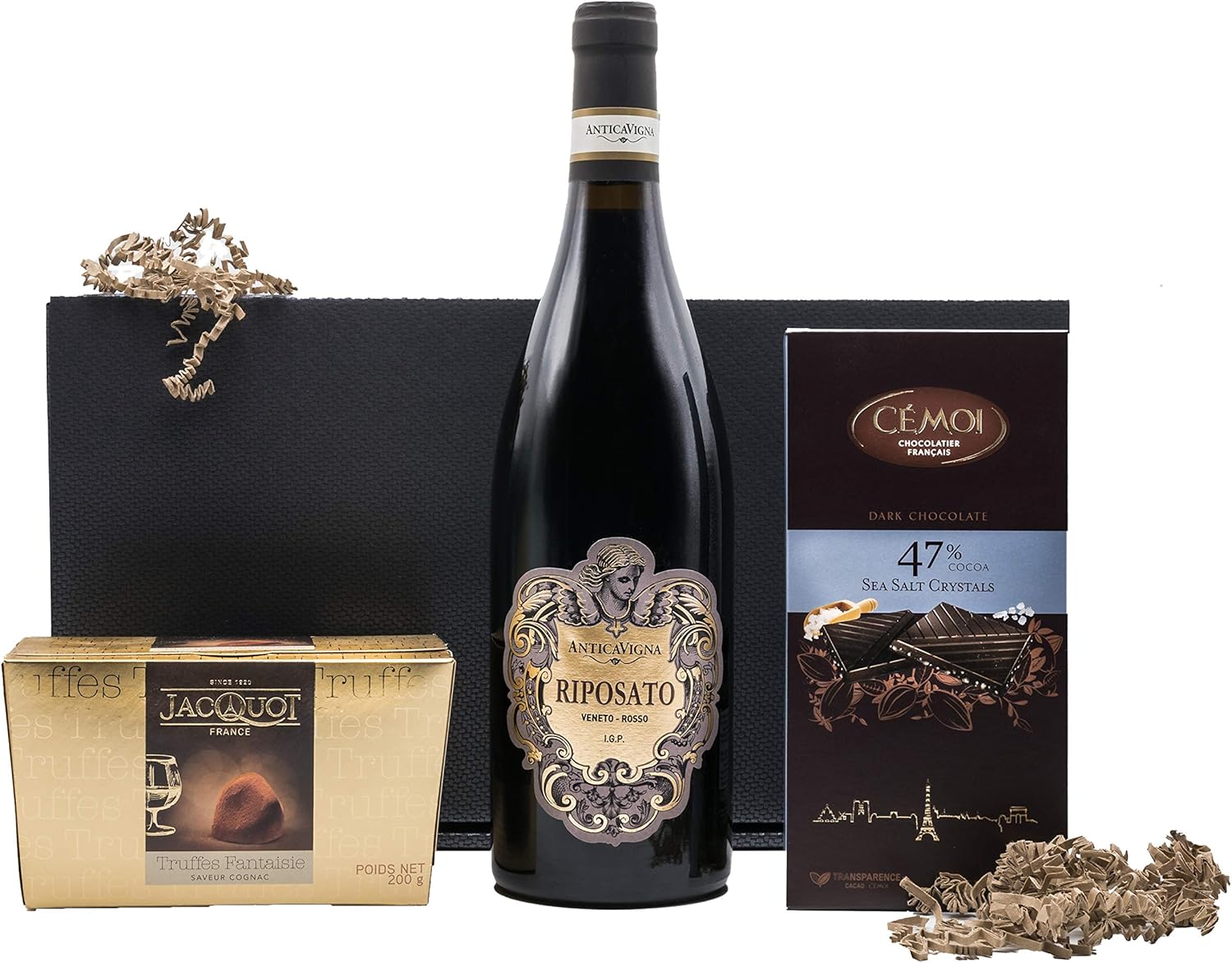 Produkt 1: Set beinhaltet: 1 Flasche 0,75 l Riposato von Antica Vigna | 1 x 100g französische Schokolade mit Meersalz | 1 x 200g Cognac-Trüffelpralinen aus Frankreich | elegante Geschenkverpackung