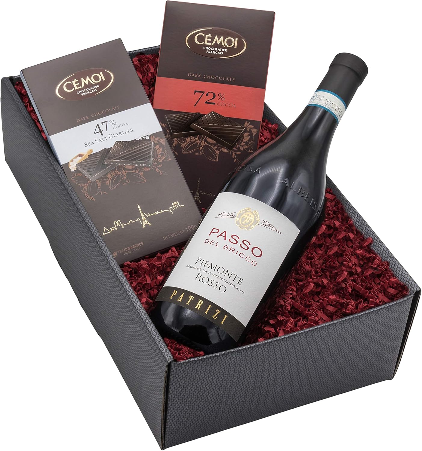 Rosso Passo Geschenkset mit Wein und Schokolade in einer schönen Geschenkbox | Italienischer Rotwein Rosso Passo und französische Schokolade in Geschenkverpackung