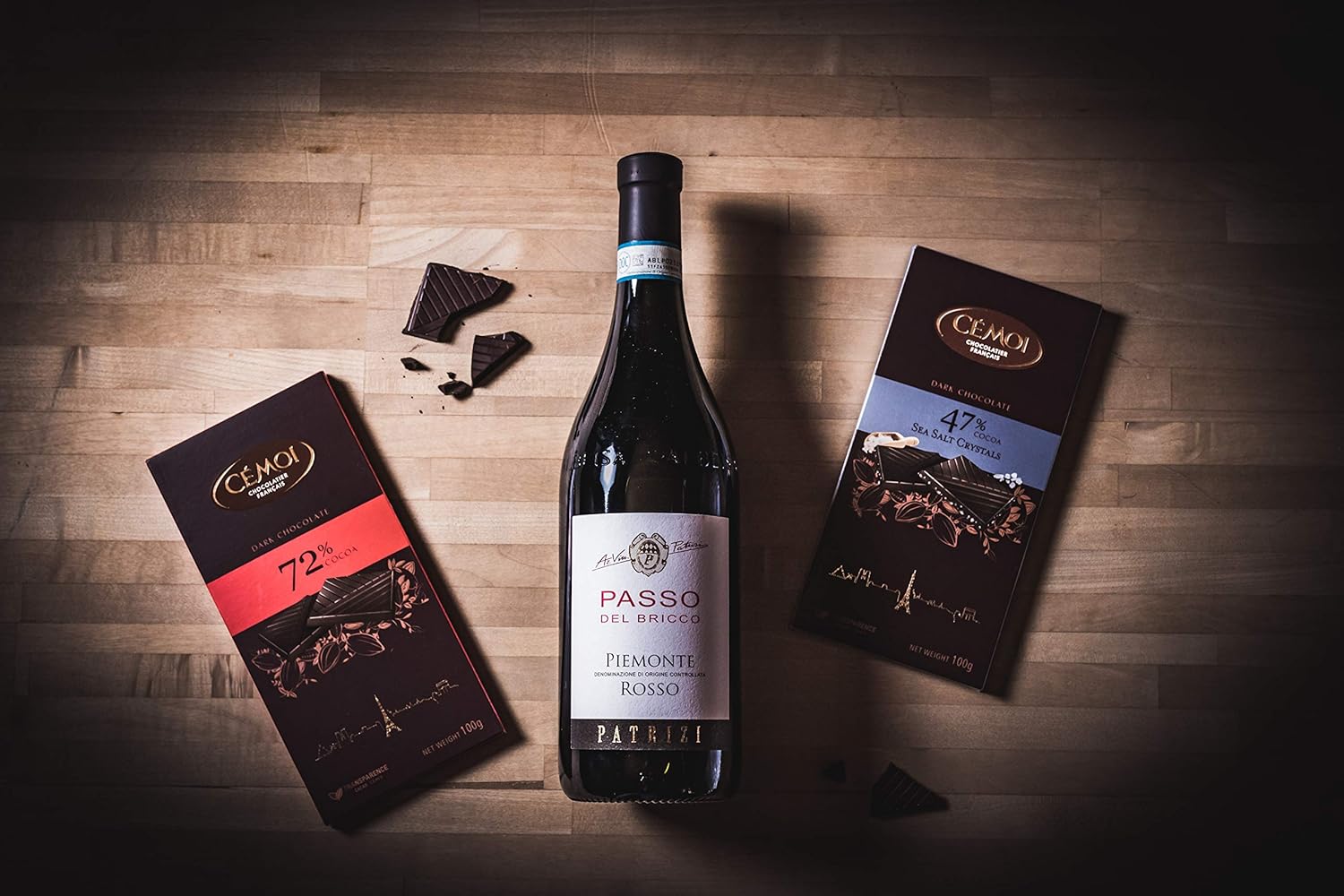 Schenken Sie perfekten Genuss oder genießen Sie das Rosso Passo Geschenkset bestehend aus 1 Flasche Passo del Bricco – Piemonte Rosso DOC von patrizi 0,75 l, 1 x 100 g französische Schokolade mit Meersalz, 100 g französische Schokolade mit einem Kakaoanteil von 72 % von cemoi und das alles in einer eleganten Geschenkbox.