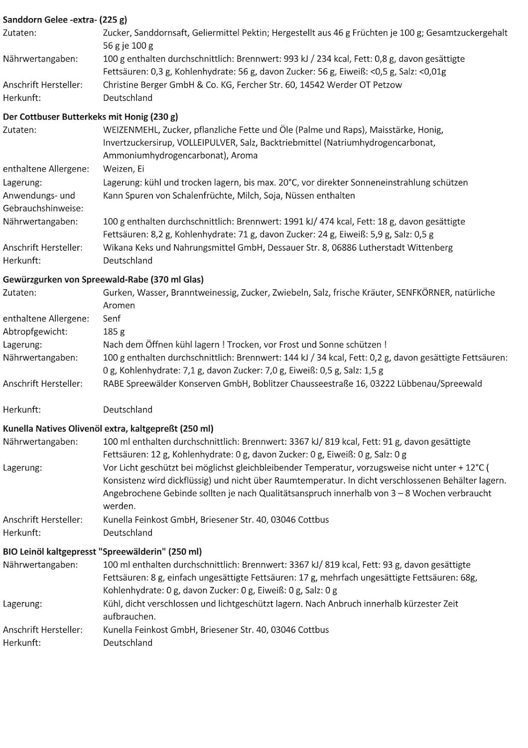 1 x Original Spreewälder Rahmmeerrettich im Glas (100 g), 1 x Spreewälder Sekt (0,2 Liter/11 % Vol.), 1 x Original Spreewälder Hausmacher-Leberwurst (250 g), 1 x Kunella Delikatess Mayonnaise (250 ml), 1 x Gurkensnack Get One – Die eingelegte Gurke aus der Dose (1 Gurke / 100 g), 1 x Sanddorngelee – Extra (225 g), 1 x Der Cottbuser Butterkeks mit Honig (230 g), 1 x Gewürzgurke aus Spreewald-Rabe (370 ml Glas), 1 x Kunella Olivenöl extra vergine, kaltgepresst (250 ml), 1 x Bio-Leinöl kaltgepresst ‚Spreewälderin‘ (250 ml), 1 x Kunella Himbeeressig (100 ml), 1 x Spreewälder „Scharfe Henne“ (Senf / 173 ml), 1 x Janks Johannisbeerwein (0,7 Liter/8,5 % Vol./Mehrweg), 1 x Sauerkirschennektar (0,2 l/Mehrweg), 1 x Bautzner Brutzelsauce Paprika Ungarische Art (250 ml), 1 x Hallorenkörbchen Größe 3, ca. 45 x 33 x 38 cm (L x B x H).
