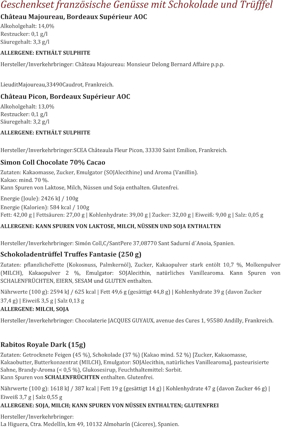 Zum Warenkorb hinzufügen Zum Warenkorb hinzufügen Zum Warenkorb hinzufügen Zum Warenkorb hinzufügen Kundenrezensionen 4,5 von 5 Sternen 36 4,4 von 5 Sternen 65 5,0 von 5 Sternen 10 5,0 von 5 Sternen 3 5,0 von 5 Sternen 1 Preis 52,90 € 52,90 € 51,90 € 51,90 € 56,90 € 56,90 € 43,90 €43,90 € — Weinart Rotwein Rotwein Weißwein Rosé Rotwein Herkunftsland Frankreich Frankreich Italien Frankreich Frankreich Trinktemperatur 16-18°C 16-18°C 10-12°C 10-12°C 16- 18° C Besonderheit Pastete & Trüffel & Feigen 3 x Rotwein (Bordeaux) Schokoladentrüffel Trüffel & Ameretti Käsekräcker & Schokolade Anlass Geburtstag, Weihnachten Jubiläum, Geburtstag Hochzeit, Weihnachten Muttertag, Geburtstag Weihnachten, Geburtstag