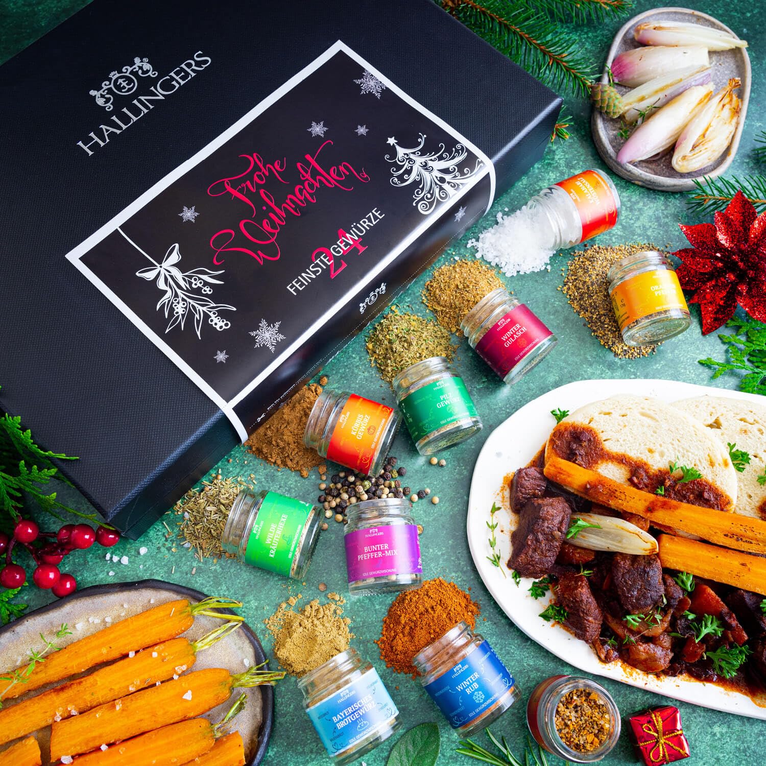 Wein-Präsentkörbe – Hallingers Merry Christmas – 24 Gewürze Geschenkset für Weihnachten und Advent – Handgefertigt, 24 Gewürze aus aller Welt (Set) – Geschenkideen Weihnachten & Geschenke Adventskalender | Neues Zuhause G
