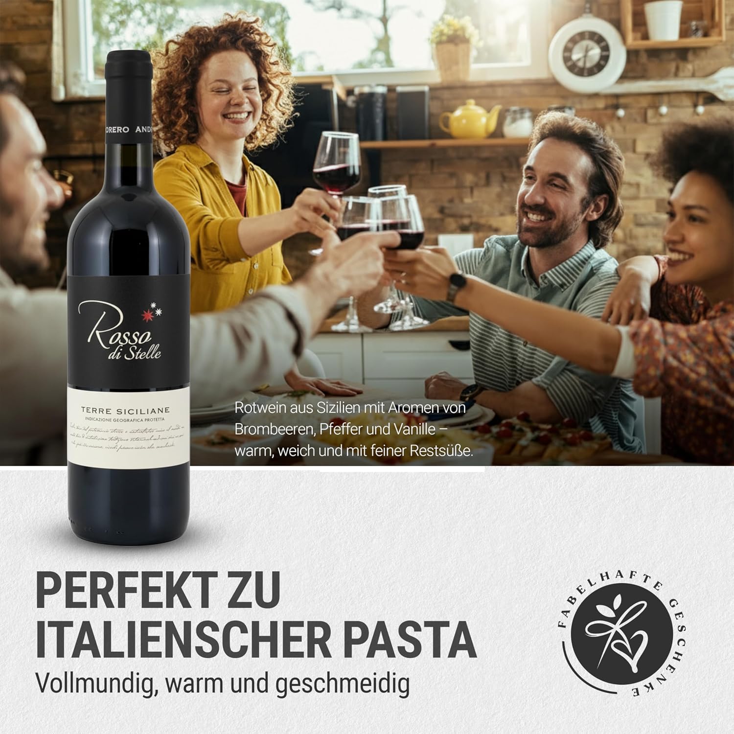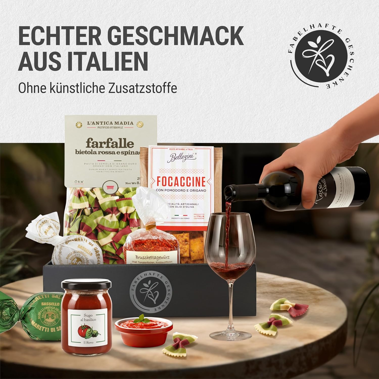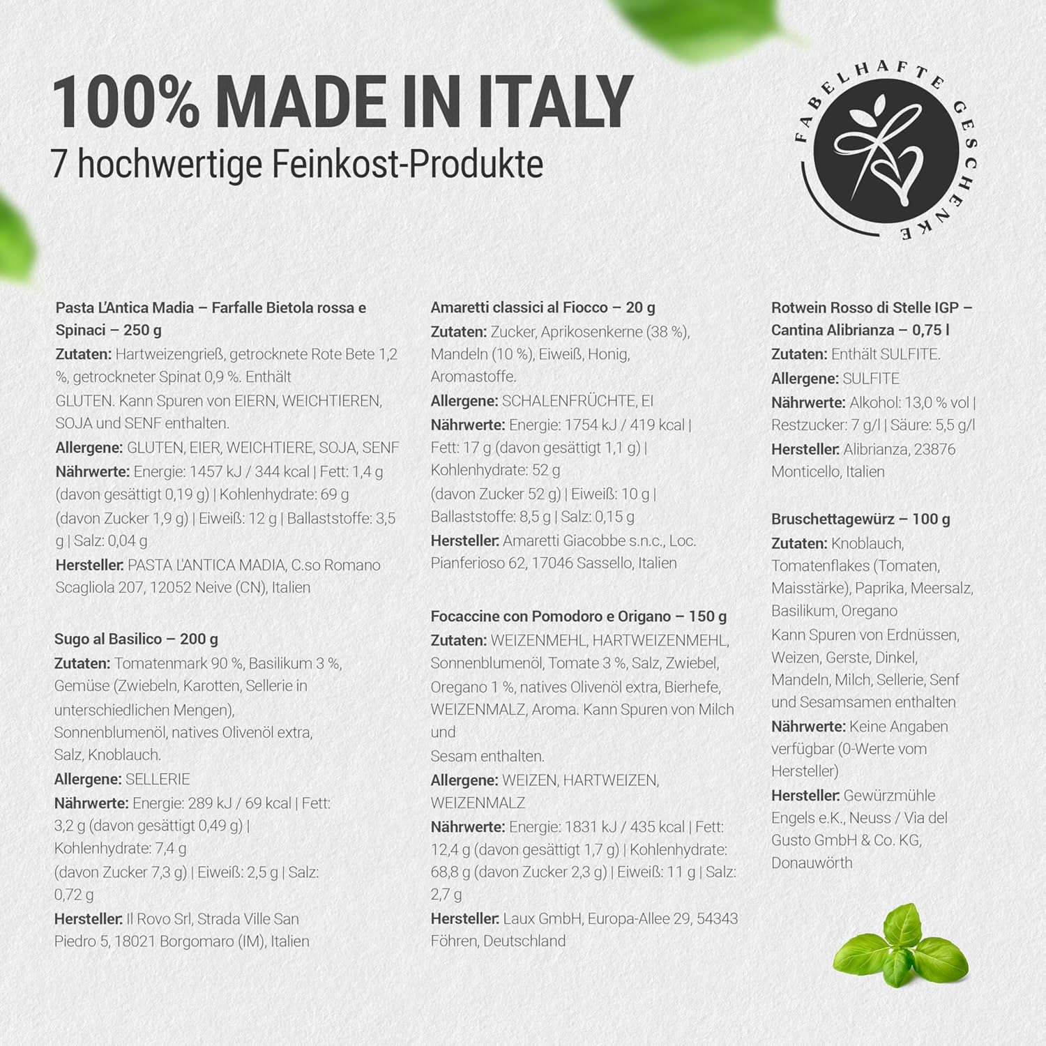 Dieser Geschenkkorb enthält viele Köstlichkeiten für einen Abend zu zweit. 1 Flasche sizilianischer Rotwein Rosso di Stelle IGP | Weingut Andrero | dunkles Rubinrot. Ein Rotwein aus dem sonnenverwöhnten Süden Italiens mit Aromen von reifen Brombeeren, einem Hauch Pfeffer und Leder. Am Gaumen ist der Rosso di Stelle angenehm warm und geschmeidig. Ein Rotwein mit schöner Restsüße. 1 x Sugo Pomodoro e Basilico: Italienische Tomaten 88 %, Zwiebeln, Basilikum 2 %, natives Olivenöl extra, Salz, Zucker | 1 x Farbfalle: Hartweizengrieß, getrocknete Rüben 1,2 %, getrockneter Spinat 0,9 %. Enthält Gluten. Kann Spuren von Ei, Schalentieren, Soja und Senf enthalten. | 1 x Bruschetta-Gewürz: Tomatenflocken, Knoblauchflocken, Meersalz, Paprika, Oregano, Basilikum. Focaccine mit Tomate und Oregano: Weizenmehl, Hartweizenmehl, Sonnenblumenrouge, 1 % Oregano, Bierhefe, 3 % Tomaten, natives Olivenöl extra, Weizenmalz, Salz, Zwiebeln, natürliches Aroma. Kann Spuren von Sesamsamen enthalten. 2 x Amaretti: Zutaten Zucker, Aprikosenkerne (38 %), Mandeln (10 %), Eiweiß, Honig, Aromen