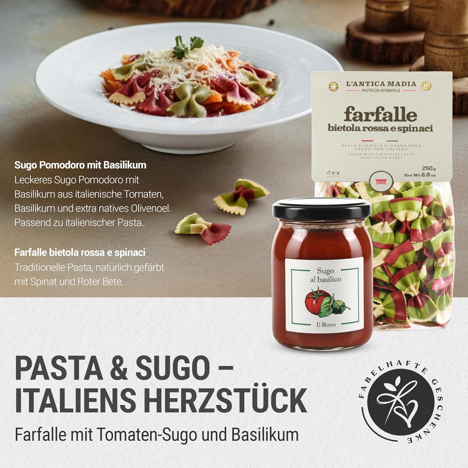 Pasta- und Tomaten-Sugo mit Basic: Farfalle Bietola Rosa e Spinaci (250 g) von L’Antica Madia in den Farben Italiens kombiniert mit klassischem Tomaten-Sugo POMODORO E BASILICO (180 g) – für original italienischen Pasta-Genuss.