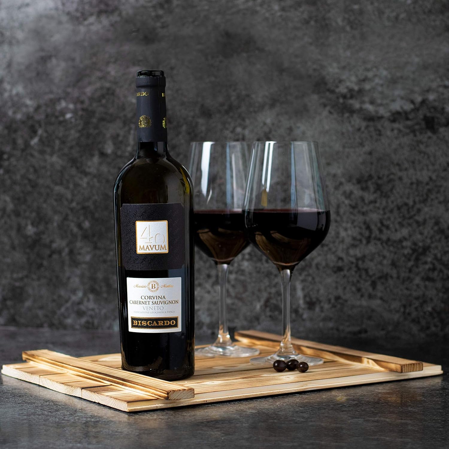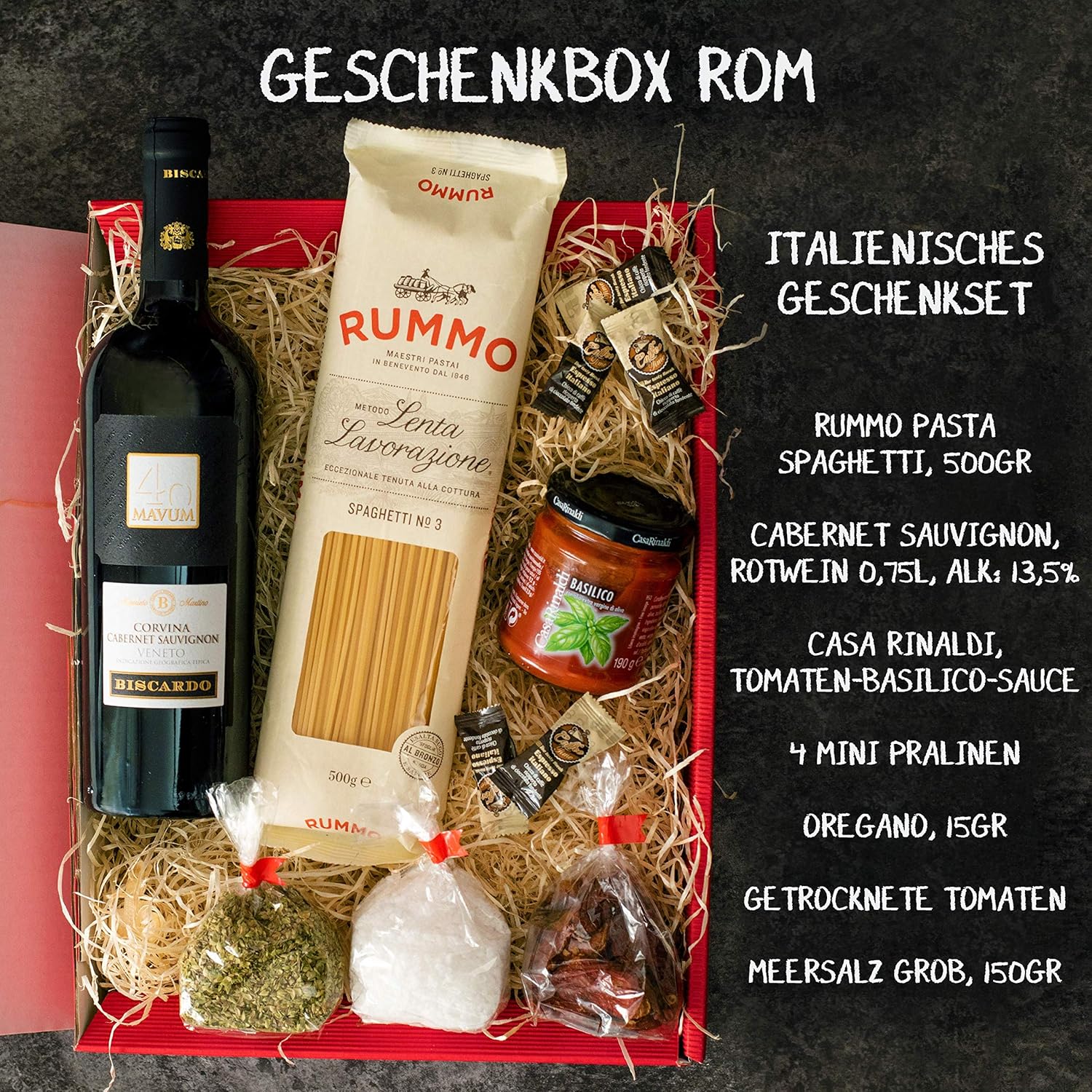 Rotwein Corvina – Cabernet Sauvignon Mavum 2017 0,7 l Spaghetti Rummo 500 g Tomatensauce mit Basilikum 190 gOregano 15 g, getrocknete Tomaten 20 g, grobes Meersalz 150 g4 Mini-Pralinen mit Kaffeebohnen. Verpackt in der roten Geschenkbox