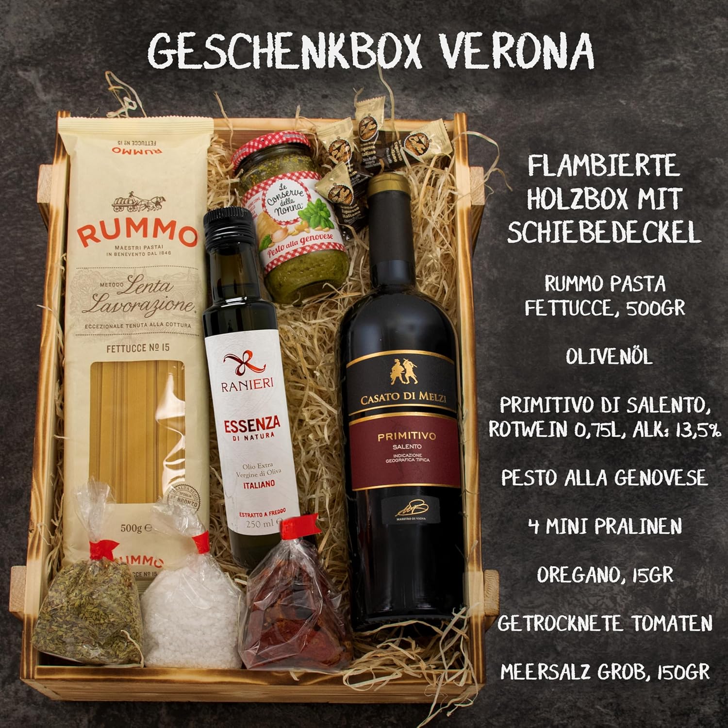 Wein-Präsentkörbe – Italienisches Geschenkset Verona, Geschenkkorb gefüllt mit Wein, italienischen Spezialitäten & eleganter Holzkiste, Geschenkkorb für Männer und Frauen zum Geburtstag, Weihnachten