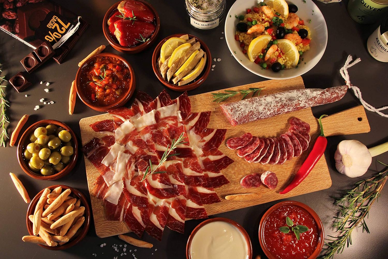 Salsa Tumaca, Allioli – Spanischer Knoblauchdip, Natives Olivenöl Extra 100 % Serrana de Espadán, Meersalz mit mediterranen Kräutern, Tapas-Snack-Nussmischung, dunkle Schokolade 70 % Kakao, Picos Artesanos Tapas-Gebäckstangen