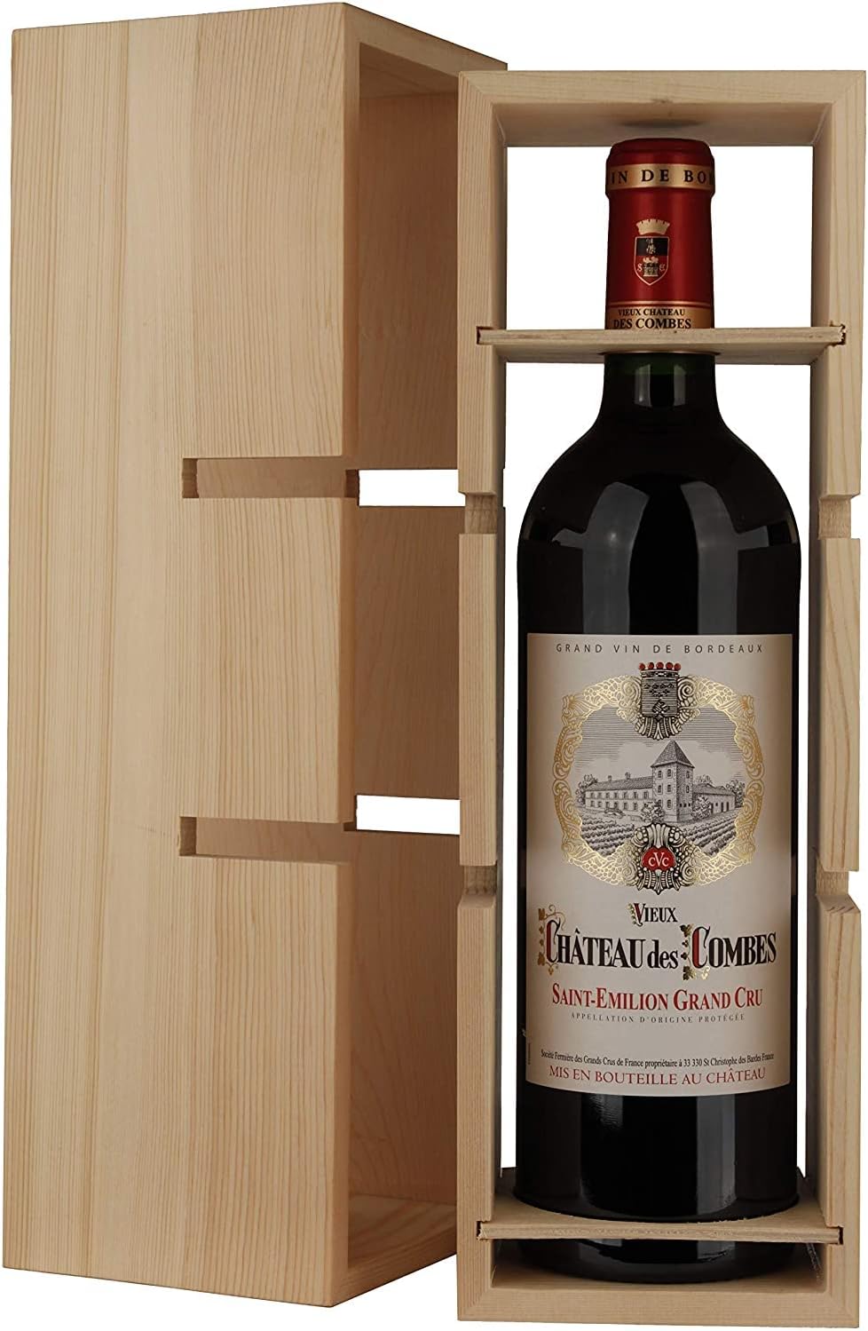 Dieses Wein-Geschenkset enthält eine Flasche Rotwein Vieux Château des Combes, Saint Emilion Grand Cru in einer Holzkiste; Die Holzkiste lässt sich in ein Weinregal verwandeln