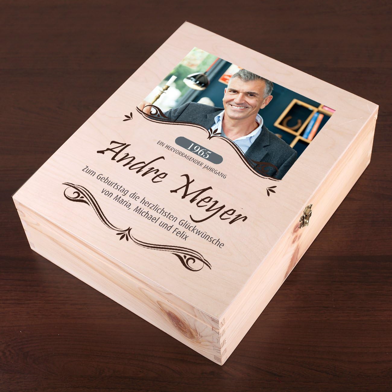 Wir personalisieren die Geburtstagsgeschenkverpackung mit dem Namen, dem Foto und dem Geburtsjahr des Jubiläums. Auch für persönliche Glückwünsche zum Ehrentag ist genügend Platz.