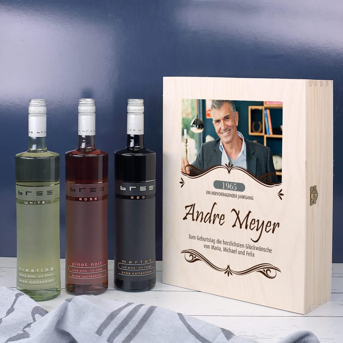 Wenn Sie auf der Suche nach einem besonders eleganten und hochwertigen Geschenk sind, dann haben wir das Richtige für Sie. Das Geschenkset besteht aus einer eleganten Holzkiste, die graviert und mit drei verschiedenen Flaschen Wein gefüllt ist. Bei den Bree-Flaschen handelt es sich um einen Merlot-Rotwein, einen Pinot Noir-Roséwein und einen Chardonnay-Weißwein. Die drei Weine befinden sich in der Holzkiste und sind gut mit Holzwolle verpackt. Das Besondere an diesem Geschenkset ist die Holzverpackung. Ihr Wunschfoto wird oben auf den Deckel gedruckt. Nachfolgend fügen wir die Jahreszahl, den Wunschnamen und Wunschtext ein. Auch Ornamente in Braun zieren das Motiv auf dem Deckel. Diese Geschenkbox ist ideal für einen Geburtstag. Mit der Holzkiste haben Sie auch später noch eine schöne Erinnerung an den besonderen Tag.
