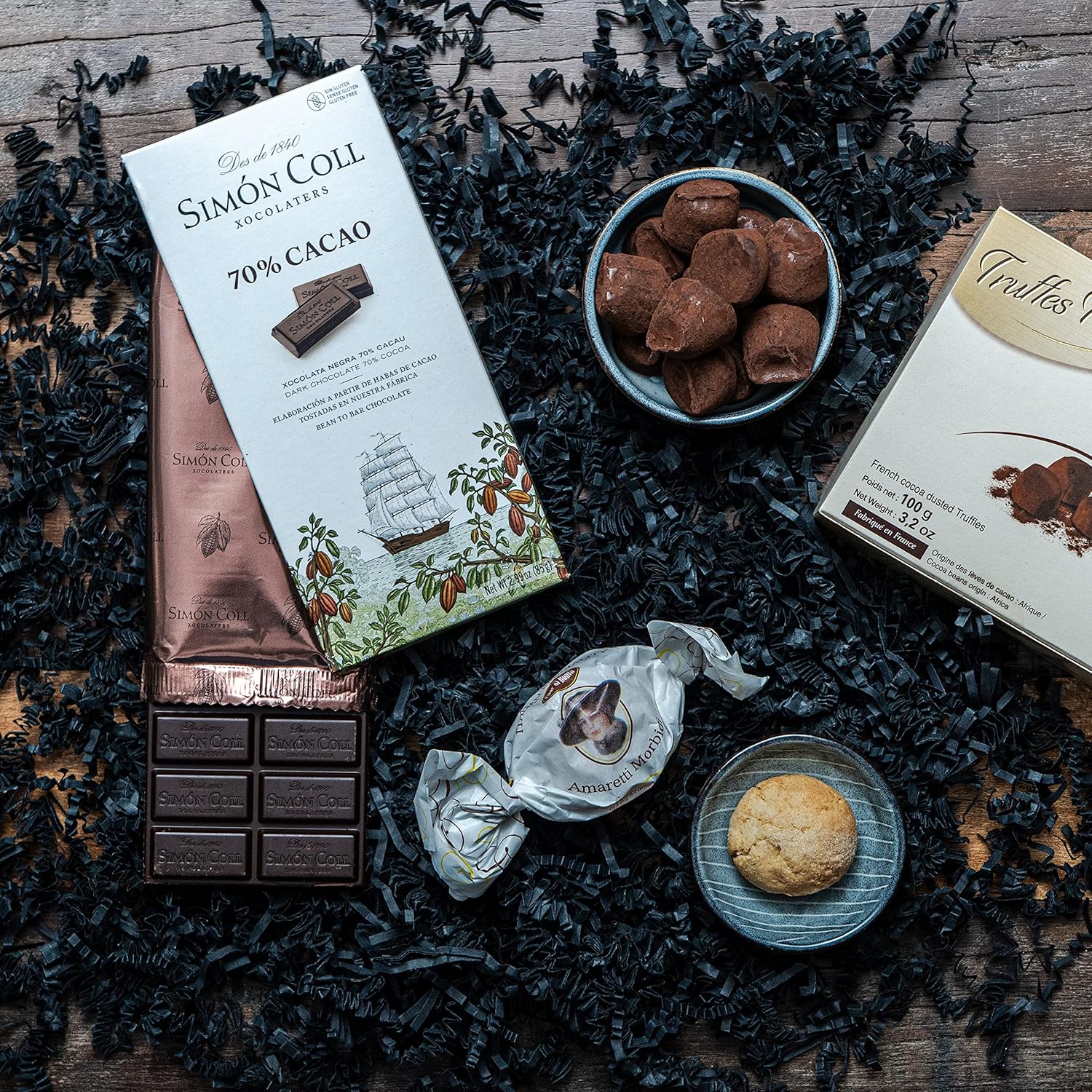 Simón Coll ist einer der ältesten Chocolaterien (1840 gegründet) Spaniens, der bereits in der sechsten Generation geführt wird. Mit über 180 Jahren Erfahrung stellt die Schokoladen – Manufaktur feinste Schokoladen in Barcelona her. Extrafeine Bitterschokolade mit mindestens 70 % Kakaoanteil, hergestellt aus echten Kakaobohnen nach Familienrezept. Hergestellt nach alter Tradition ohne Gluten.