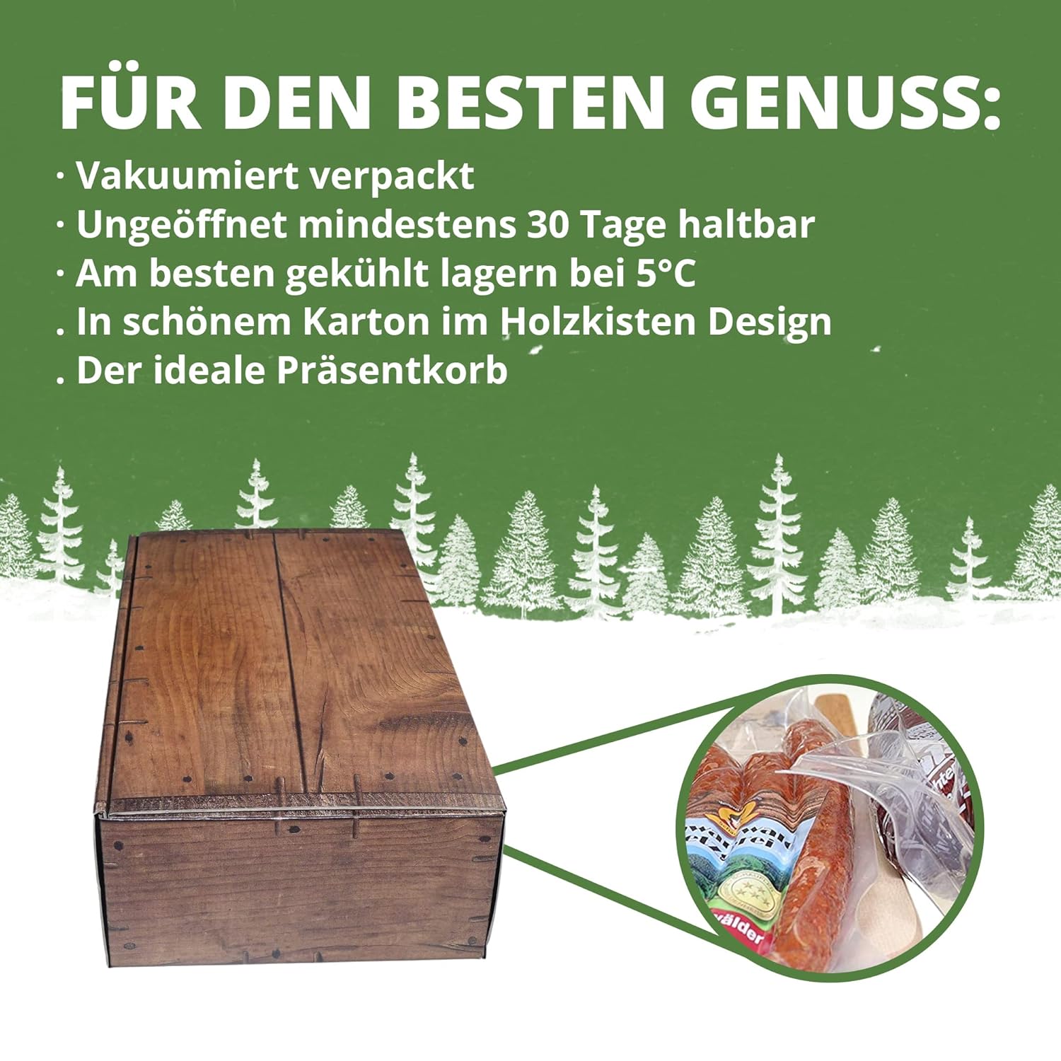 – Sicher vakuumverpackt: Unsere Wurstspezialitäten werden alle frisch vakuumverpackt und im Wurstkarton sicher zu Ihnen nach Hause geschickt. Lagern Sie jede Komponente unseres Lebensmittelkorbs bei 5°C und halten Sie ihn so mindestens 30 Tage lang haltbar.