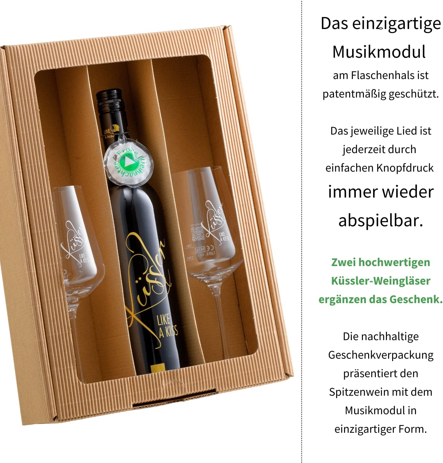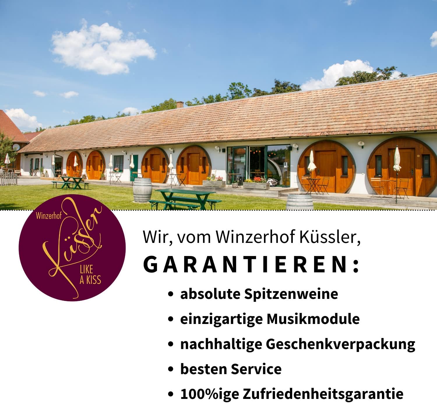 Unsere Weine zeichnen sich durch besondere Qualität, Qualität und jahrtausendealte Tradition aus. Auch beim Song, beim Musikmodul selbst und bei der nachhaltigen Verpackung legen wir Wert auf höchste Qualität. Deshalb bieten wir eine kostenlose Rücksendung inklusive Zufriedenheitsgarantie, ohne Wenn und Aber. Sichern Sie sich jetzt das perfekte Geschenk für guten Geschmack und beste Laune – ohne Risiko!