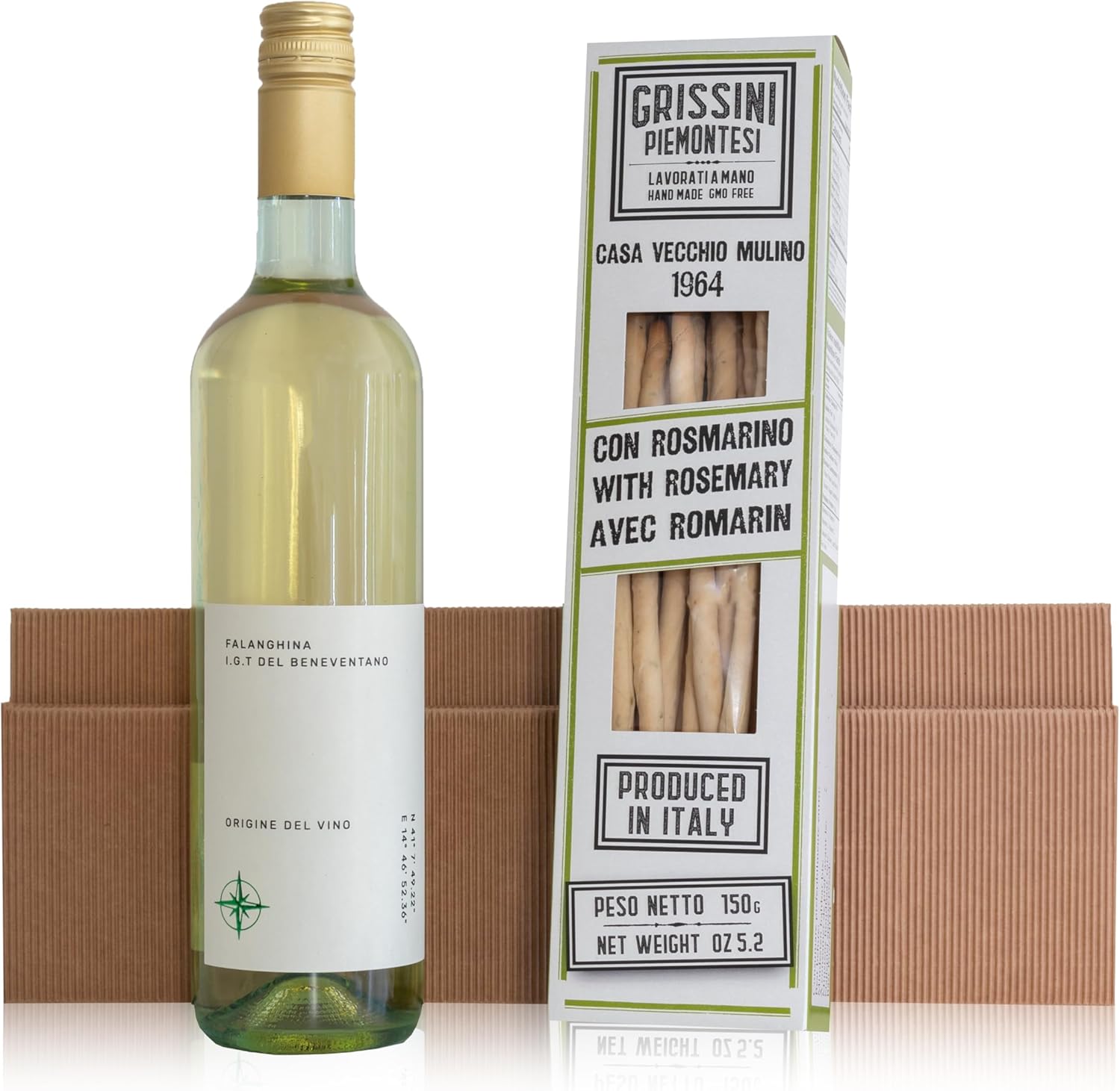 GEBEN SIE ELEGANZ IN JEDER FLASCHE Verleihen Sie einem geliebten Menschen pure Eleganz und beste Weintradition mit dem Wein Falanghina Origine del Vino. Knusprige Köstlichkeiten mit mediterranem Flair: Die Rosmarin-Grillstangen sind nicht nur ein delikater Snack, sondern auch eine hervorragende Geschenkidee, die mediterranes Flair auf den Tisch bringt. Fein abgestimmte Aromen: Mit der Geschenkpackung Falanghina Origine del Vino und Grissini mit Rosmarin zaubern Sie eine harmonische Kombination aus edlem Wein und köstlicher Frische.