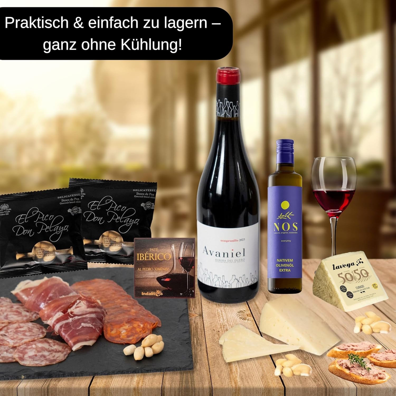 Gourmet-Geschenkbox mit Wein, nativem Olivenöl extra, iberischen Wurstspezialitäten und feinen Kuchen. Fantastisches Gourmet-Set mit hochwertigen spanischen Köstlichkeiten. Das ideale Geschenk, um Familie, Freunde oder Kollegen zu überraschen – perfekt für Weihnachten, Geburtstage oder den Vatertag.