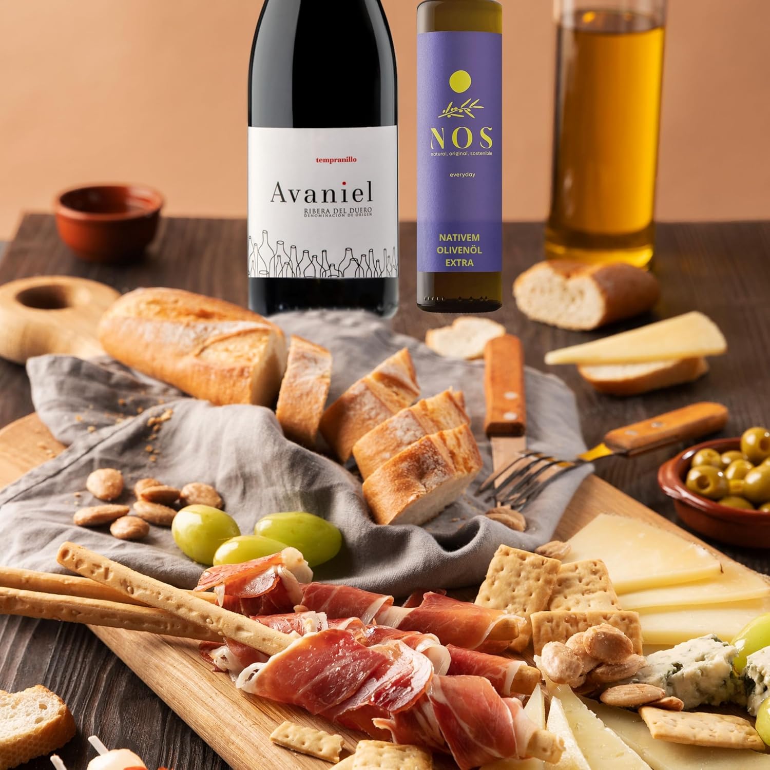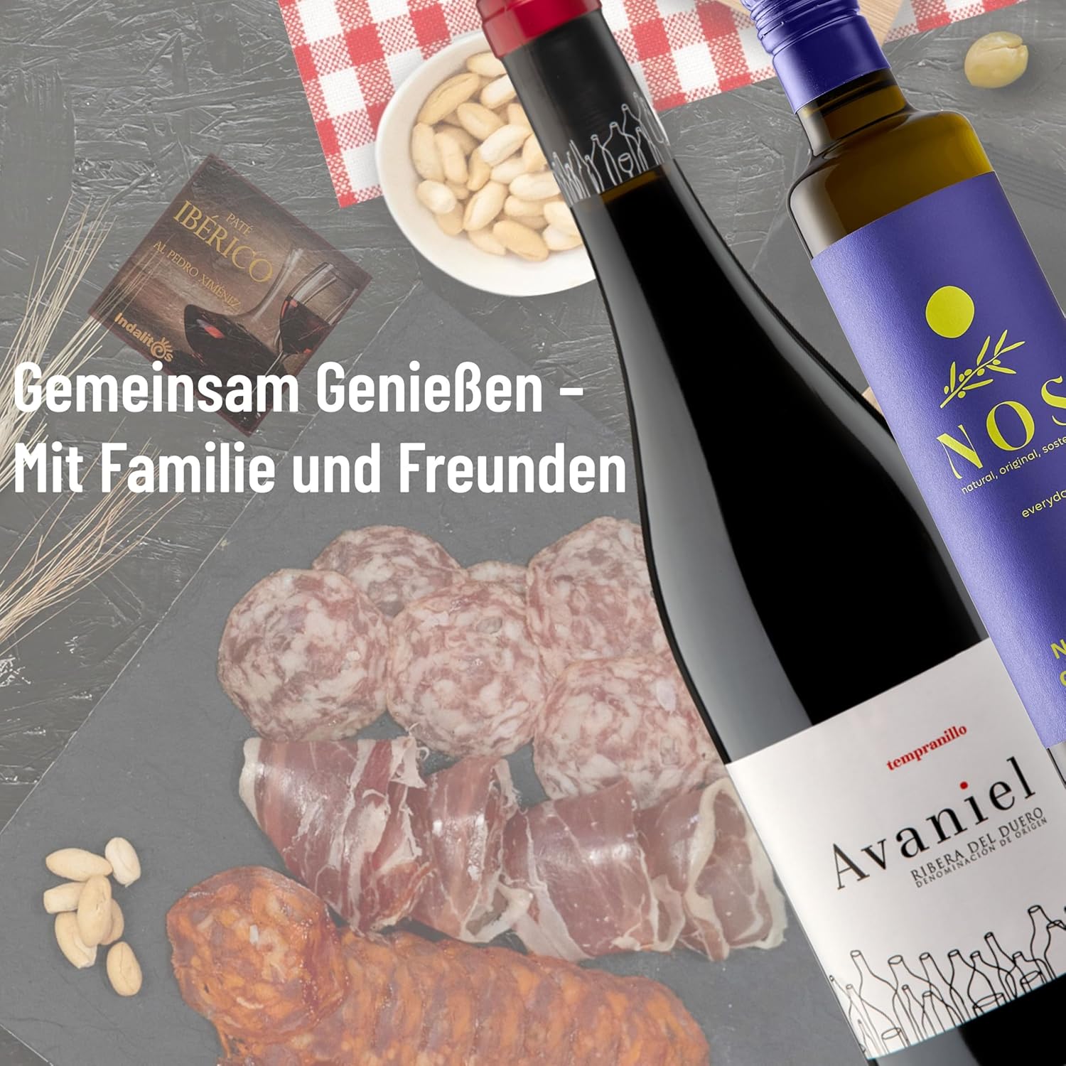 Premium-Produkte in exklusiver Auswahl. Enthält eine Flasche Rotwein mit geschützter Herkunftsbezeichnung Ribera del Duero und intensiven Fruchtaromen sowie eine Flasche 100 % natives Olivenöl extra von Arbequina. Perfekt kombinierbar mit verschiedenen Gerichten – erleben Sie unvergessliche Momente mit unserer erlesenen Weinauswahl. Praktisch und einfach zu verstauen – ohne Kühlung